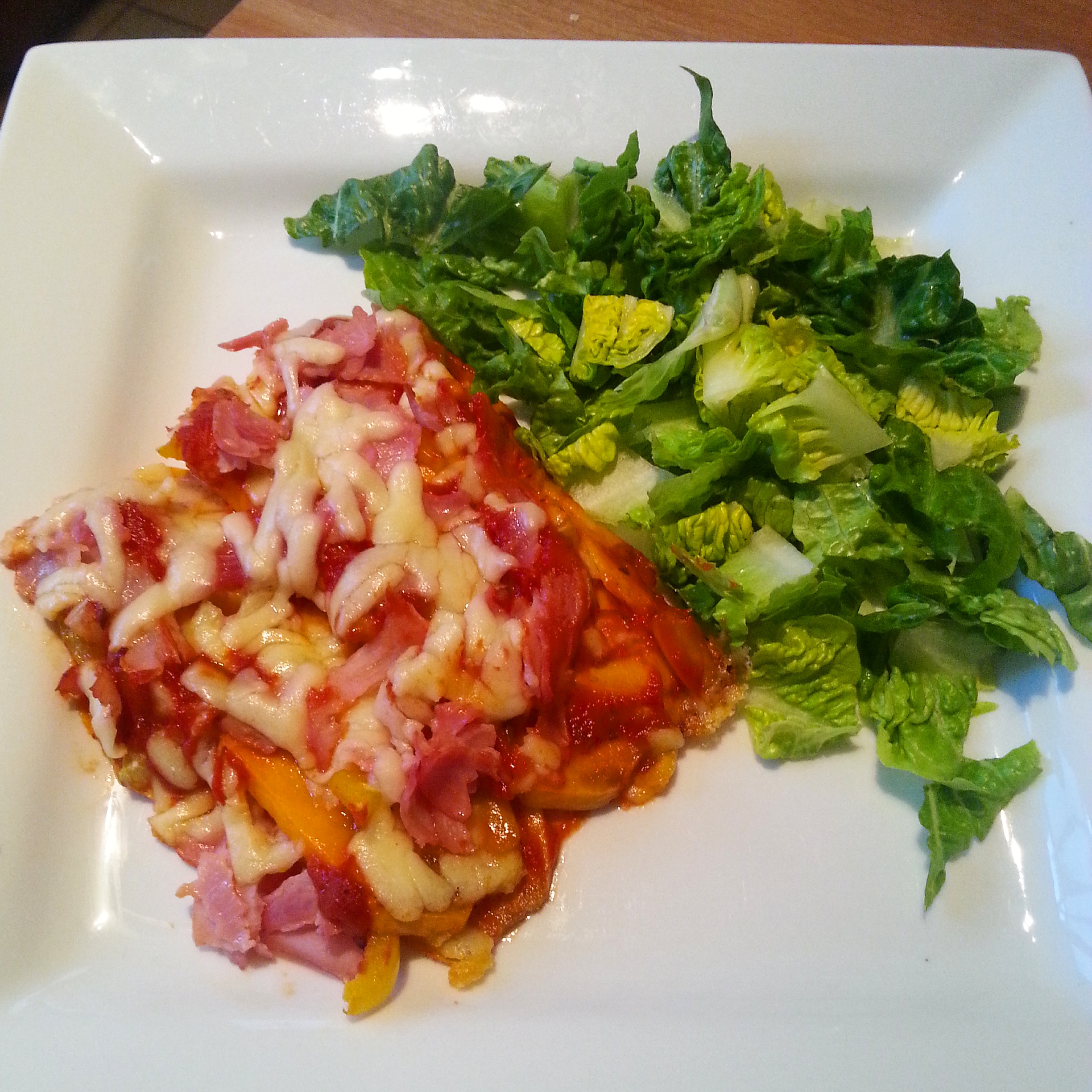 This is a great idea although I wasn’t able to pick the slices up pizza style like the recipe suggests but it was sooo tasty. It was really simple to make and you can use whatever toppings you have available. I had some crushed dried chillies left over from another recipe that I added to the tomato sauce which gave it a nice heat too – I can recommend doing that.