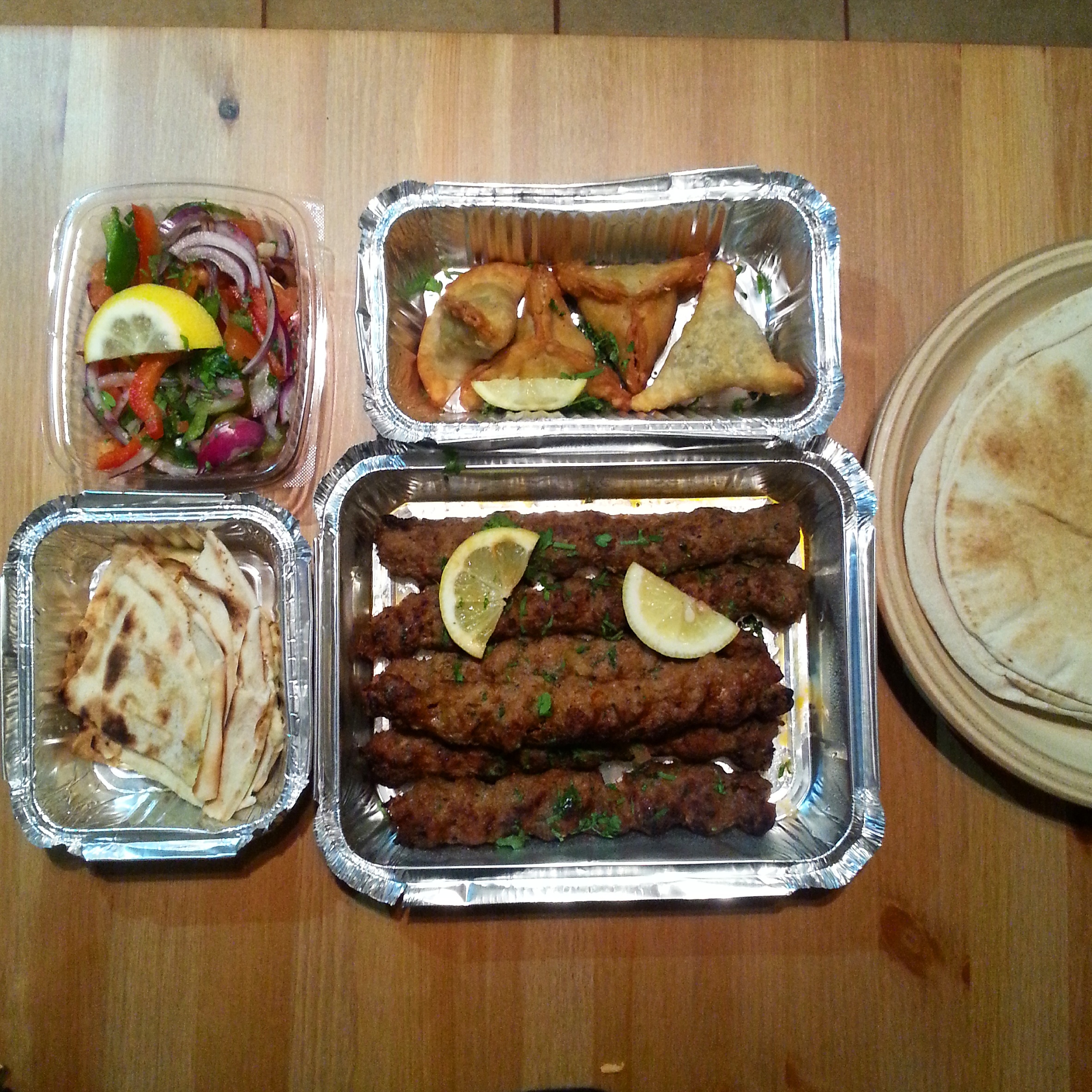 So tonight Mark and I couldn’t really be bothered to cook – we hadn’t planned anything ahead and both had long days at work. We decided to order a take-away but tried to choose something that we hadn’t ordered before. Kafta meshwieh are lamb skewers with parsley and onion served on a flatbread with hot sauce. We also ordered a couple of small dishes too – grilled kallaj (halloumi in pitta bread) and fatayer spinach (pastry with spinach, onion & pine nuts).