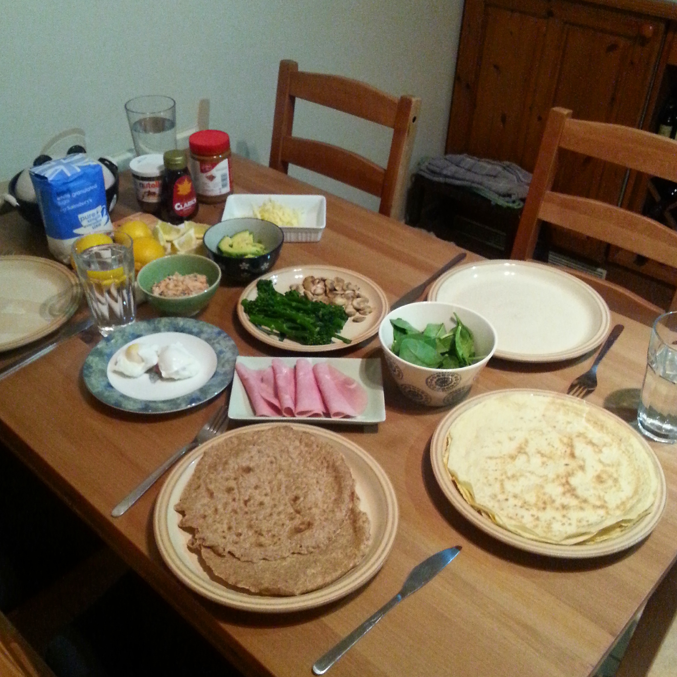 PANCAKE DAY! Ahhhh yeeeaaahhhh!! I’ve been so excited about today for aaages! Pancakes…pretty simple right? For the traditional pancake-day style crepe you get some plain flour, make a well, crack an egg into it, then add milk until you reach the desired consistency (or you could even buy one of these). Then cook, FLIP, cook some more then NOM NOM NOM with whatever toppings make you squeal with childlike JOY! I basically just laid the table with a bunch of random toppings both sweet and savoury and we just got stuck in so I can’t list what we had here. However, I personally recommend lemon + sugar (CLASSIC); Nutella + strawberries (sometimes with vanilla ice cream); banana + Nutella + peanut butter; mushrooms + chilli jam (my family love Cottage Delight’s chilli jam) + goat’s cheese; bacon + avocado + maple syrup.