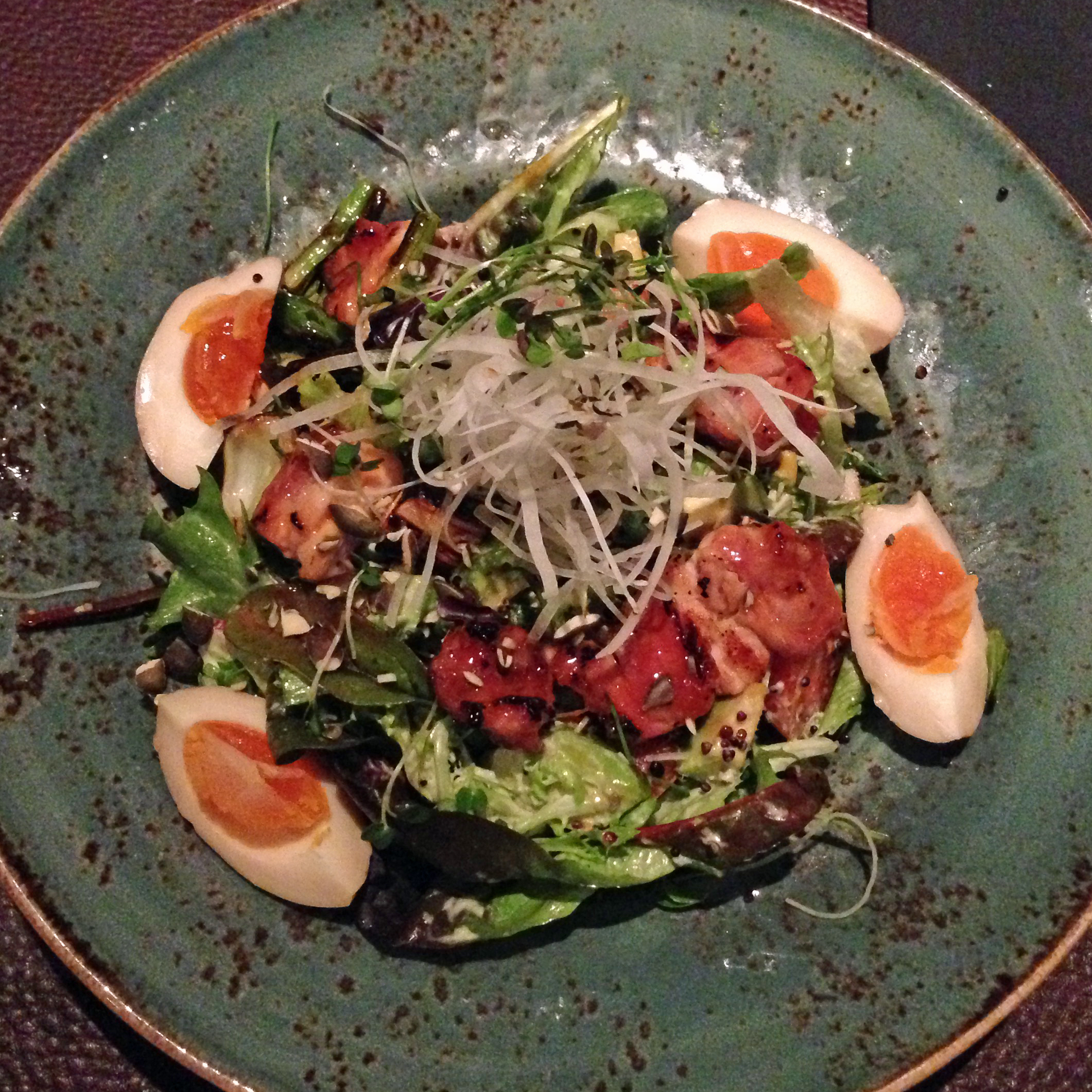 My Mum came to Wimbledon for dinner so we went out to Sticks’n’Sushi with my sister Claire. This restaurant is brilliant and I highly recommend a visit to anyone who hasn’t been before. Although it specialises in sushi there is plenty of other choice on the menu and this salad stood out as looking both healthy and delicious. I definitely wasn’t disappointed. Every part of the salad was delicious, and the portion size was spot on.