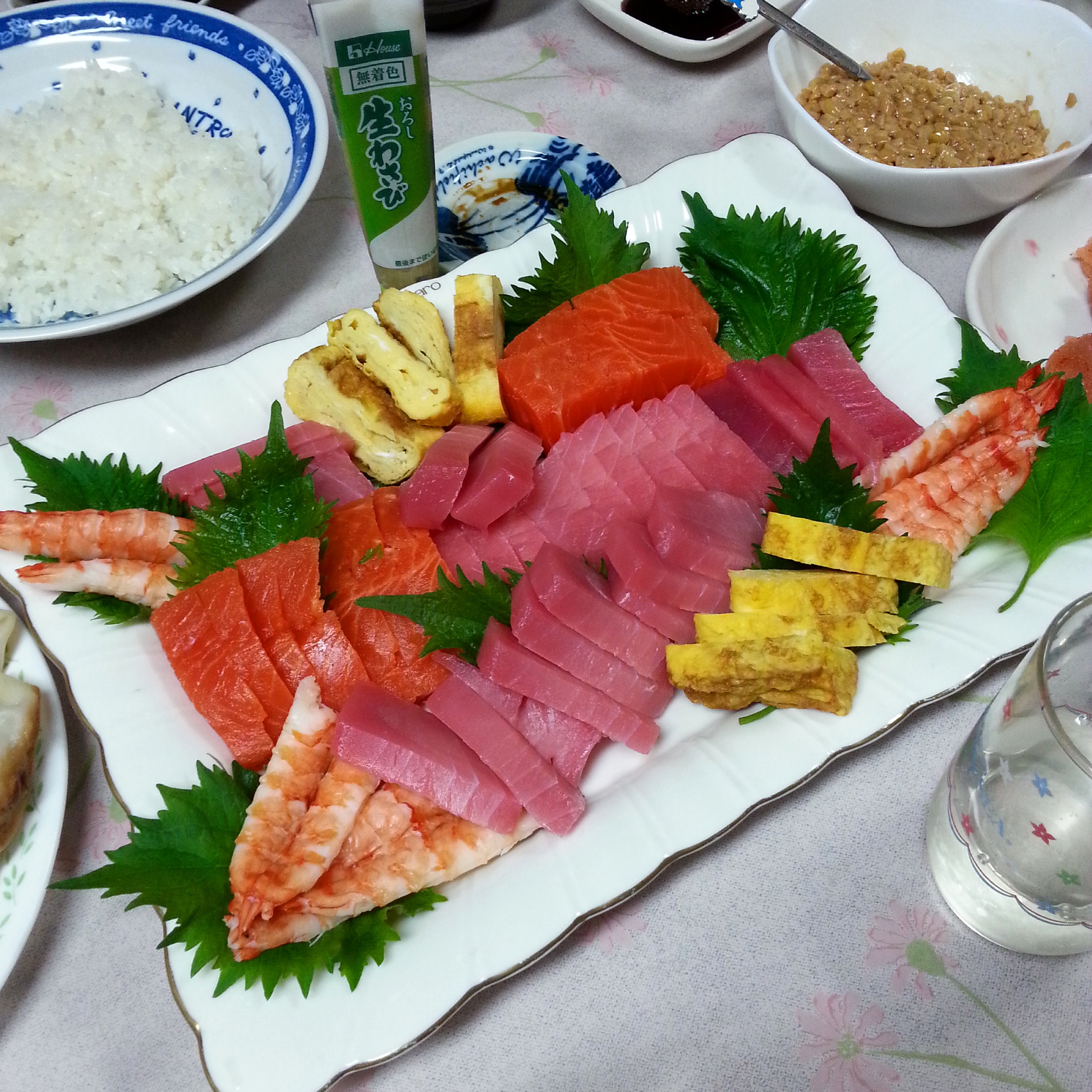 Today I almost died of happiness when I walked in to the kitchen and saw the most colourful display of food. “Te” means “hand” and “maki” is another word for sushi so Temaki is basically DIY sushi. The table was laid with bowls of sushi rice, a huge plate of assorted sashimi (sliced raw fish), a stack of nori (seaweed) sheets and other bowls of things like tuna mayo, natto (fermented soybeans) etc. To eat you just put some rice onto a nori sheet, add whatever sashimi or other topping you fancy, roll up and maybe dip in some soy sauce before eating. Delicious!