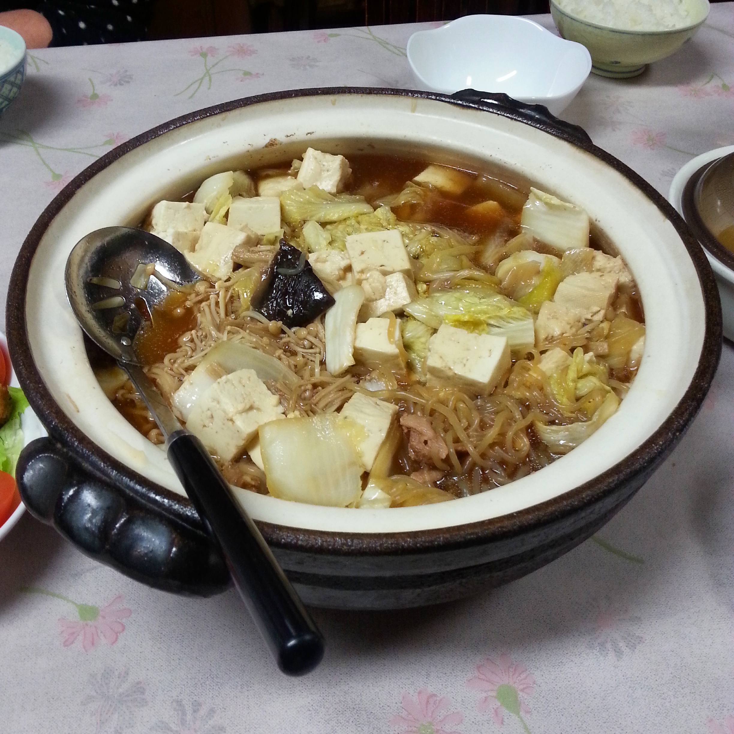 The last time Momi visited me in London she brought a beautiful sukiyaki pot designed with a panda’s face on the top. She told me that when I came to stay she would teach me how to use it, so tonight we had sukiyaki. Sukiyaki is a simple hotpot with meat, noodles, tofu, mushrooms and anything else you want to chuck in really, cooked in a soy broth. Great winter comfort food!
