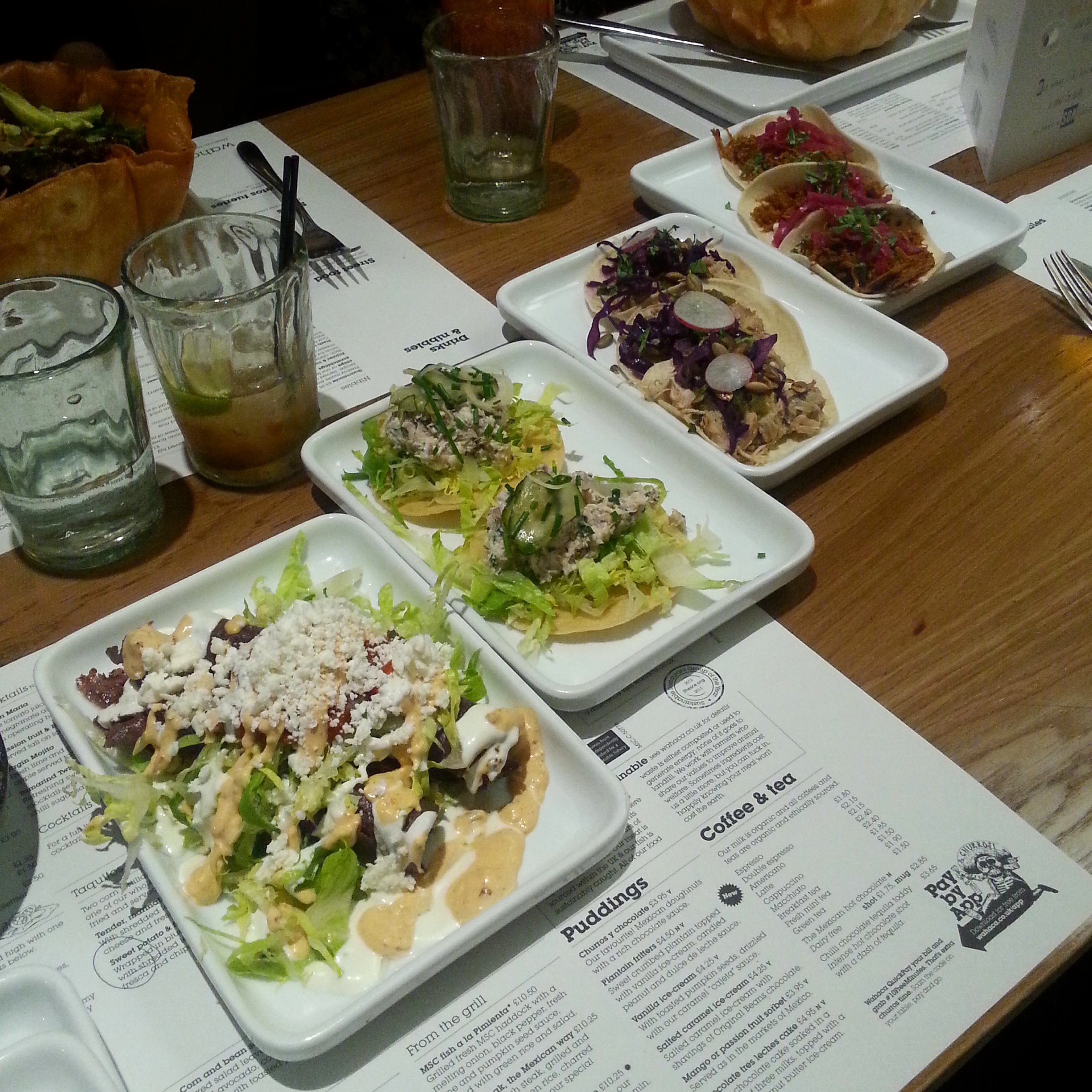 Today was Mark’s birthday and so we went out to Wahaca for some Mexican street food. We ordered a few small plates to share so that we could try a few different dishes. We ordered some frijoles to start which tasted great! I couldn’t stop going back for more! We ordered a couple of tostadas and tacos to sample, and my favourites by a mile were the sweet potato and feta taquitos – SO FLIPPIN’ GOOD! Next time I would just order a bunch of those and be done with it! Mark’s Mum and Sister ordered the salad bowls that come in a big tortilla bowl which look really fun.