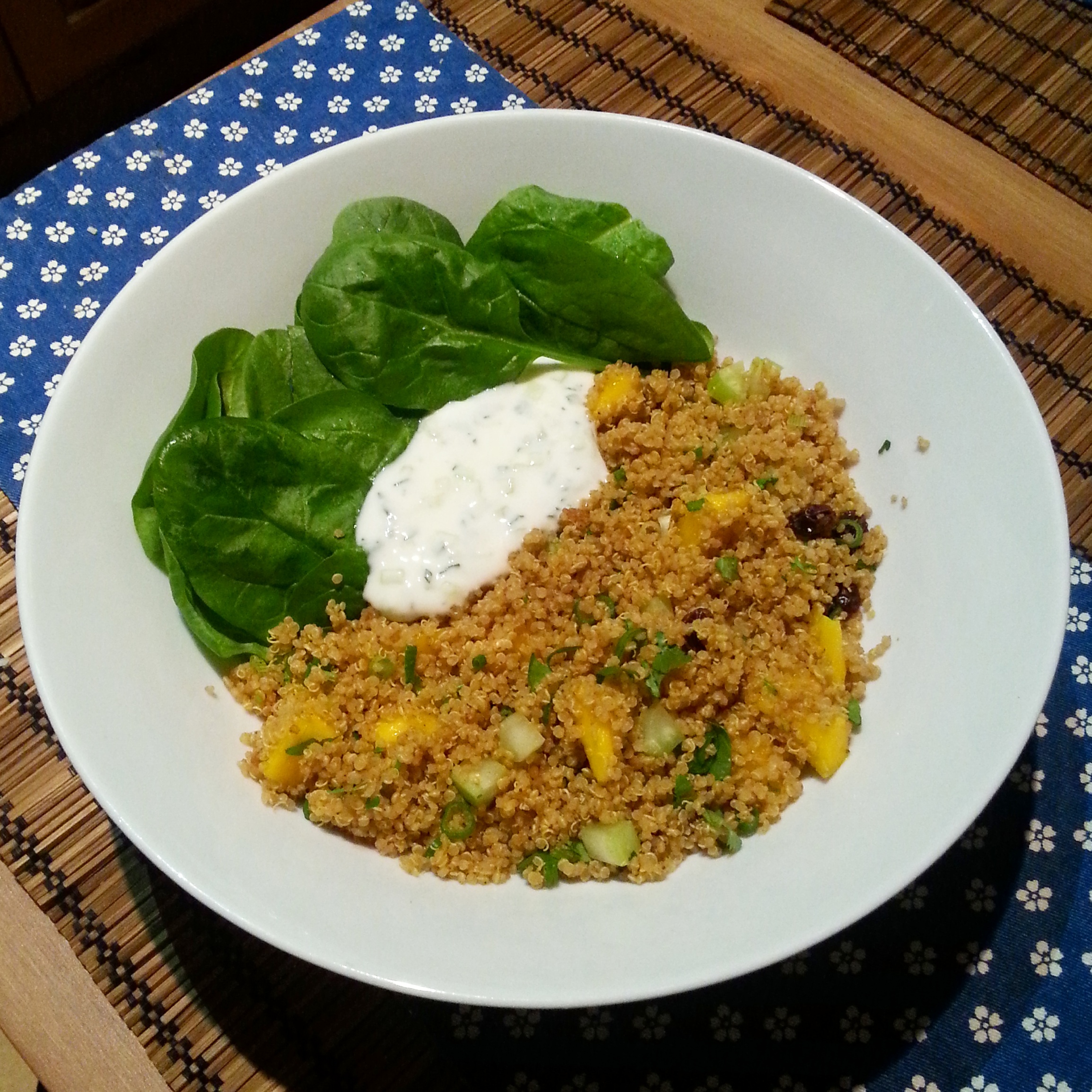 http://www.myrecipes.com/recipe/curried-quinoa-salad-with-cucumber-mint-raita