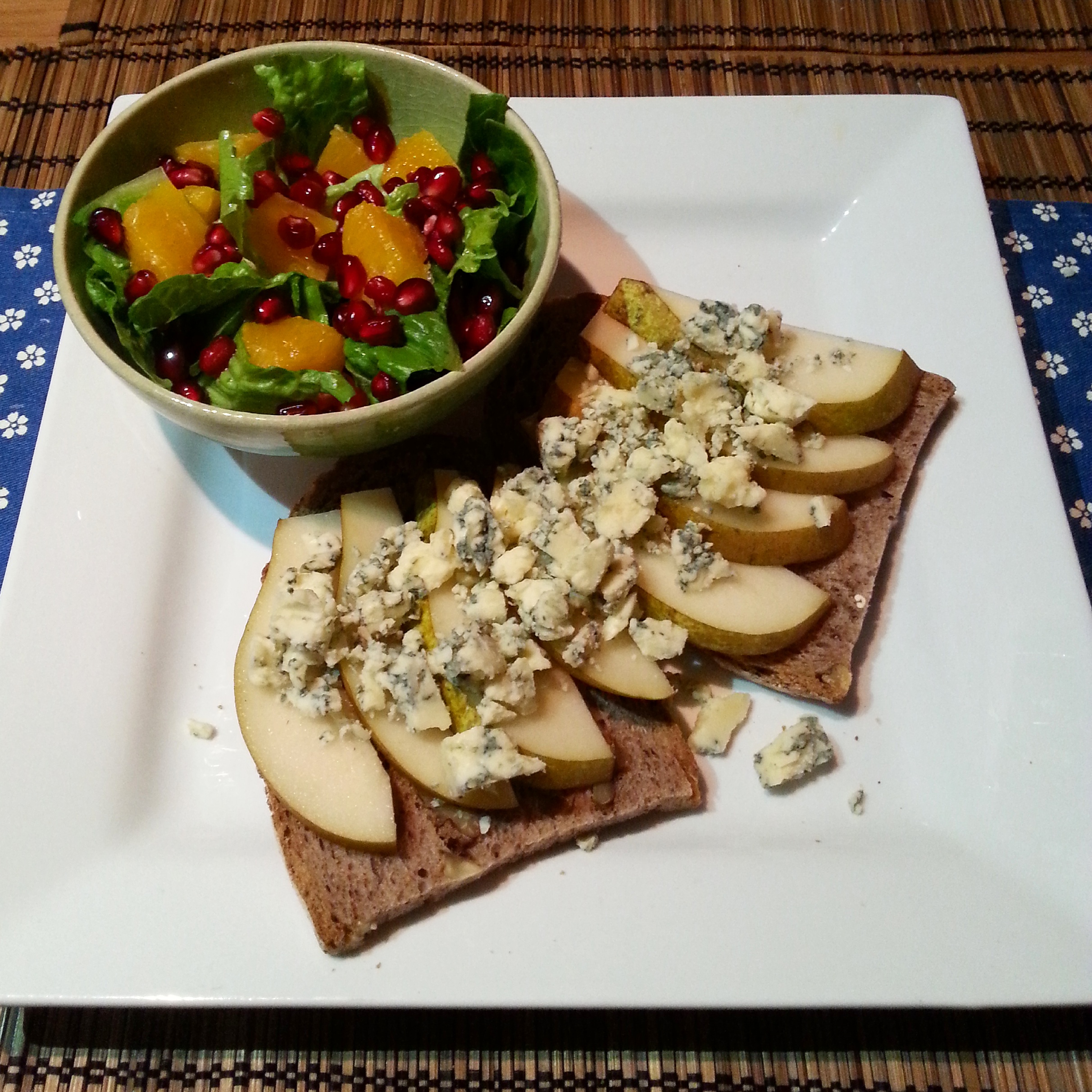 We had some Stilton and pears to use after our salad the other night and I was up in Wimbledon village today running some errands so I figured I’d pick up some of our beloved walnut bread from Le Pain Quotidien on my way home. I was really lucky as I got their last half loaf! We toasted some walnut bread, layered some sliced pear and crumled the Stilton on top and served with a side salad with pomegranate and orange segments (orange in salads = my new favourite thing!).