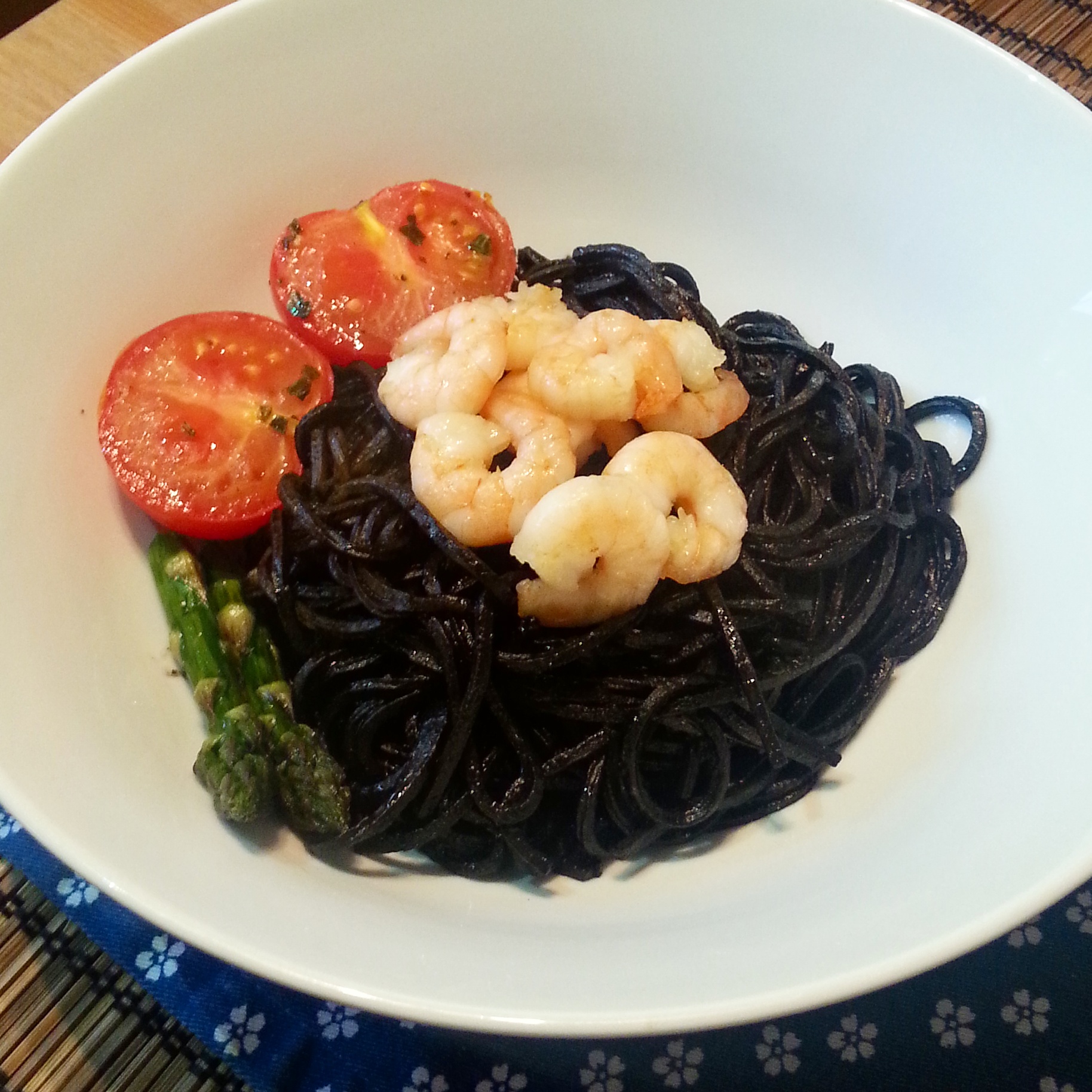 25/05/2015: Spaghetti with squid ink sauce and prawns – own recipe