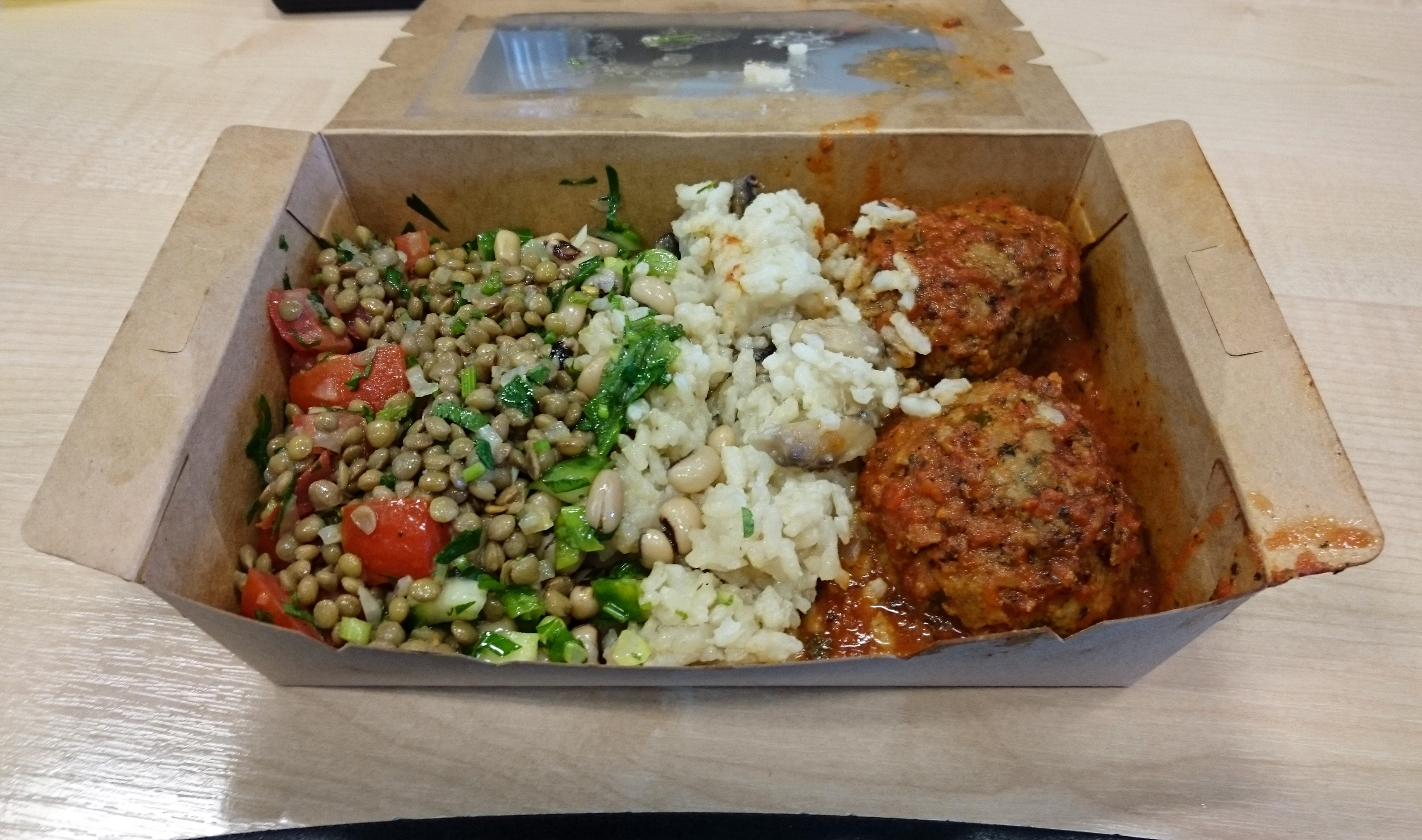 I was going to be out in the evening for dinner at a friend’s house so decided to have an exciting lunch rather than complicate dinner arrangements. When someone is cooking for a lot of people I don’t want to be a hindrance. I ended up heading back to Food Filosophy to try another one of their salad combinations. This time the meatballs caught my eye, so I combined them with a mushroom rice and two different lentil salads. The beef meatballs were excellent and I was very happy with my choice of accompaniments. I was stuffed by the end of it (the meatballs were huge!) so had to leave the slice of carrot cake I had also bought till later in the afternoon.