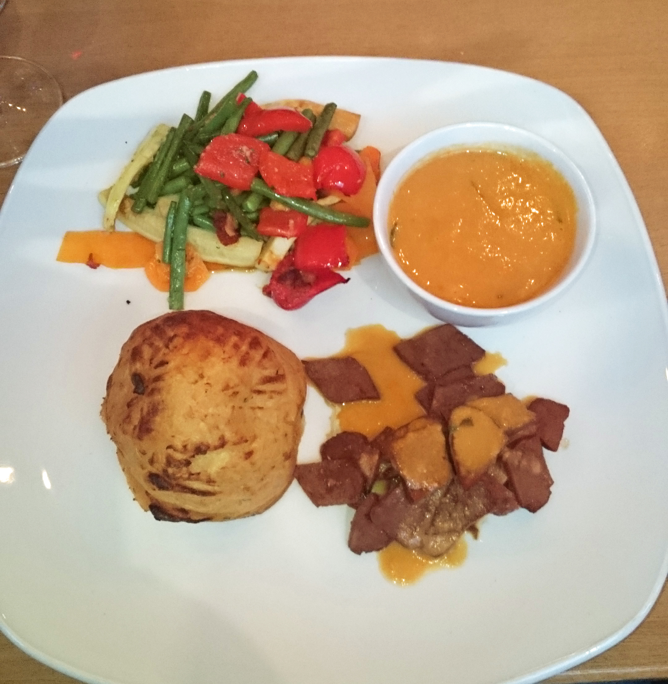 The vegan roast came as a potato and parsnip mash, roast vegetables, and seitan strips, all served with a tasty onion gravy. I was really impressed with the seitan strips, something that I’ve never had before. The texture was quite soft but could have passed for meat when on a forkful with some mash and vegetables. The star of the dish was the gravy, which I drowned everything else with, and it gave a lot of flavour to the relatively simply mash and vegetables.