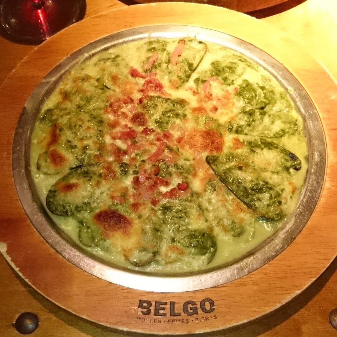 Tonight it was a friend’s birthday celebration so we went out to Belgo’s. As Mark and I have already had classic moules, we decided to try one of the moules platters. The Spinazie Platter were open mussels topped with Gruyere cheese, bacon lardons, and spinach. It sounded nice enough…but I did NOT like this dish. I expected there to be fresh spinach leaves, perhaps wilted, in with the melted Gruyere, and not part of a thick gloopy green cream. I thought the spinach cream was too thick and not that enjoyable to eat. Mark also made a good point that perhaps the combination of mussels with Gruyere didn’t quite work and the cheese, bacon, and spinach would work better without the mussels. I powered through to eat as much as I could, but was really disappointed by this.