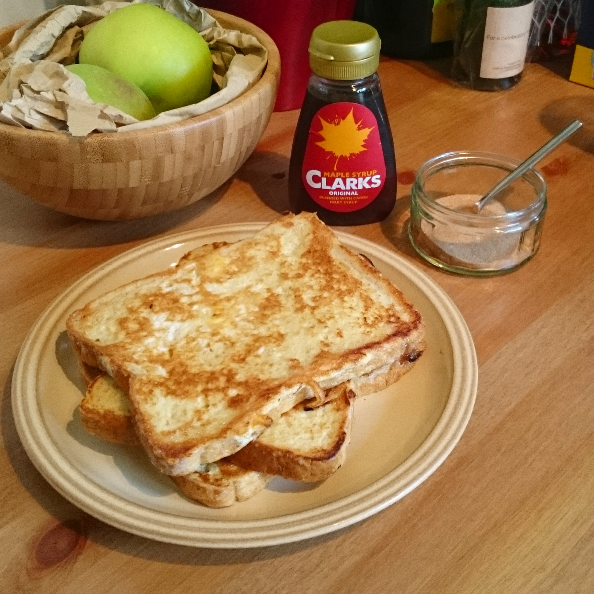 Mark suggested we make eggy bread today to use up the end of a loaf. I have eaten eggy bread before, but not with sweet toppings and I couldn’t remember what I used to eat it with! Mark went for maple syrup, but I thought I’d try some cinnamon sugar which was yummy! Bit of a naughty dinner!