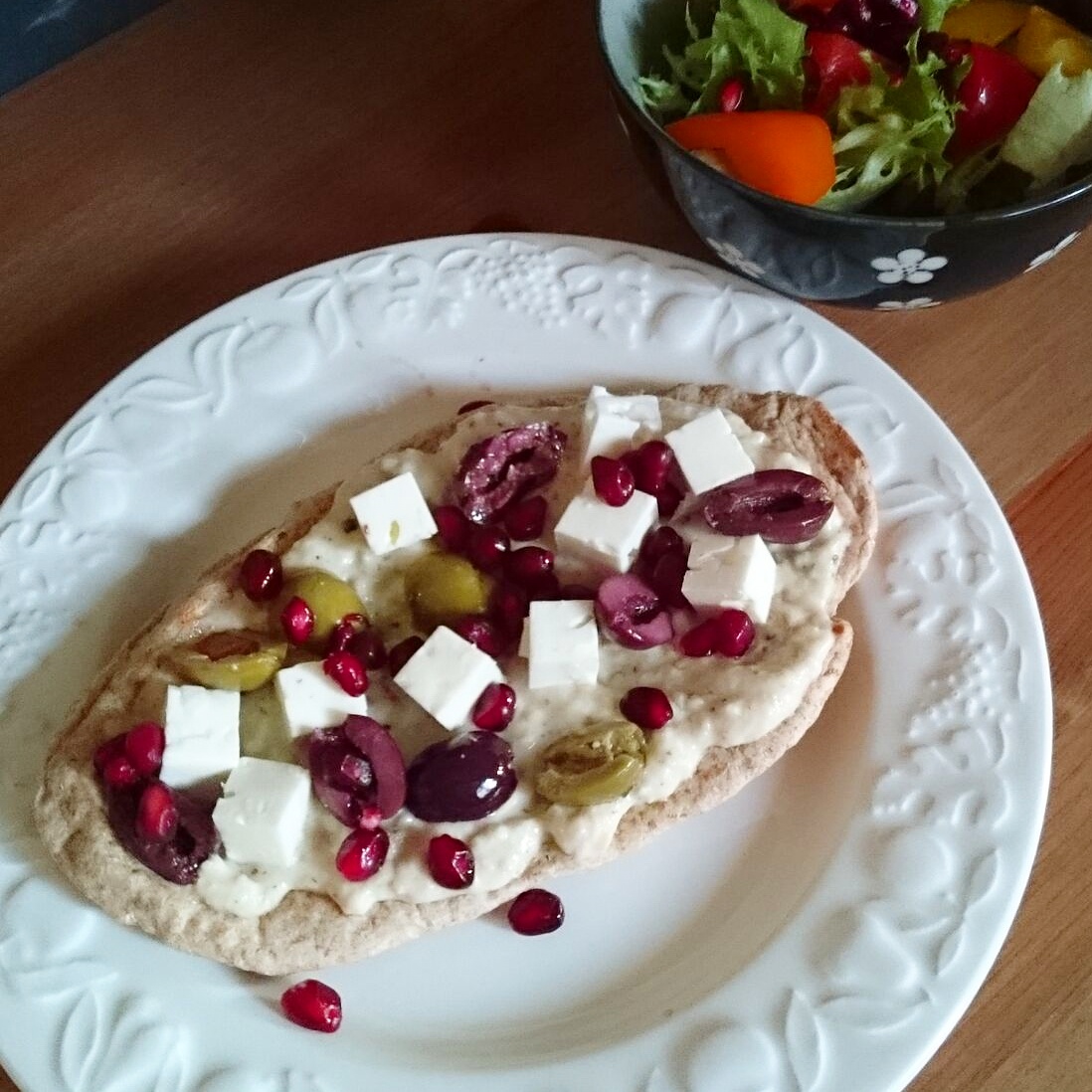 28/07/2015: Pittzas with babaganoush, feta, olives, and pomegranate