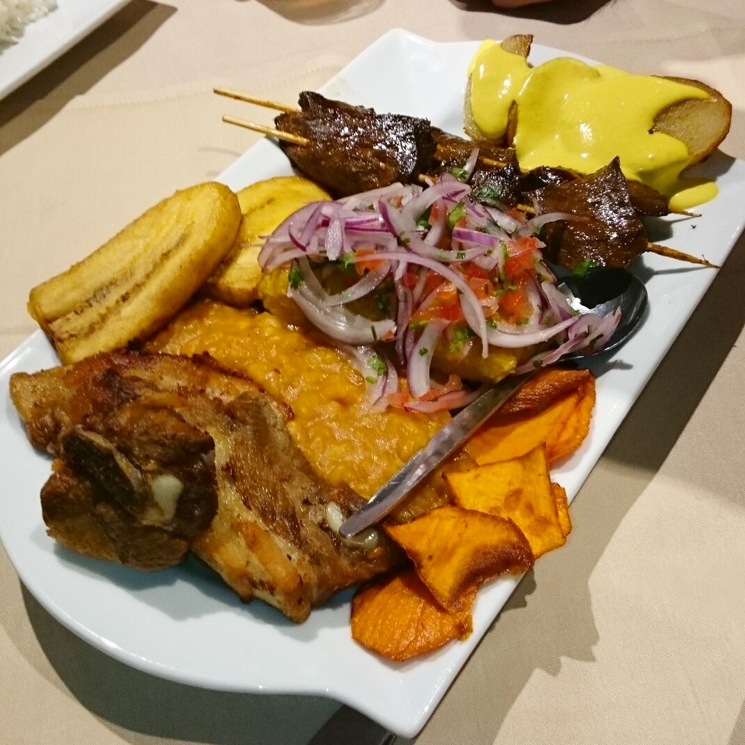 The platter included a selection of “Carapulcra” which is a dried potato stew, “Chicharron” which are peruvian style fried pork ribs, “Tamal” which is a white corn parcel filled with chicken, “Anticucho” which are grilled marinated beef heart pieces, fried sweet potato & fried ripe plantain.