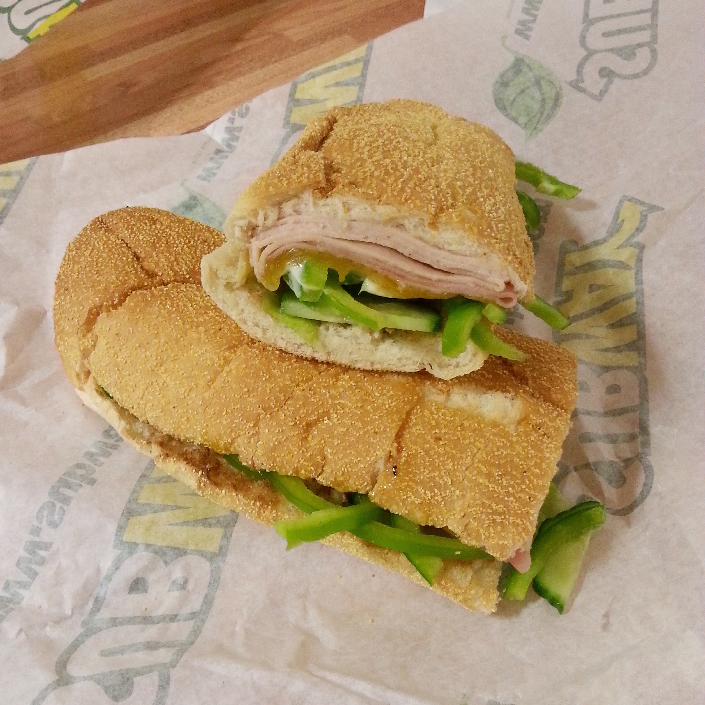We were on the way to Nottingham to visit my family and stopped on the way at a service stop to get some food. We were travelling pretty late so a lot of places were closed, but eventually we found a Subway and ordered a turkey and ham sub with salad, extra cheese, and I had some sweet onion sauce on my half.