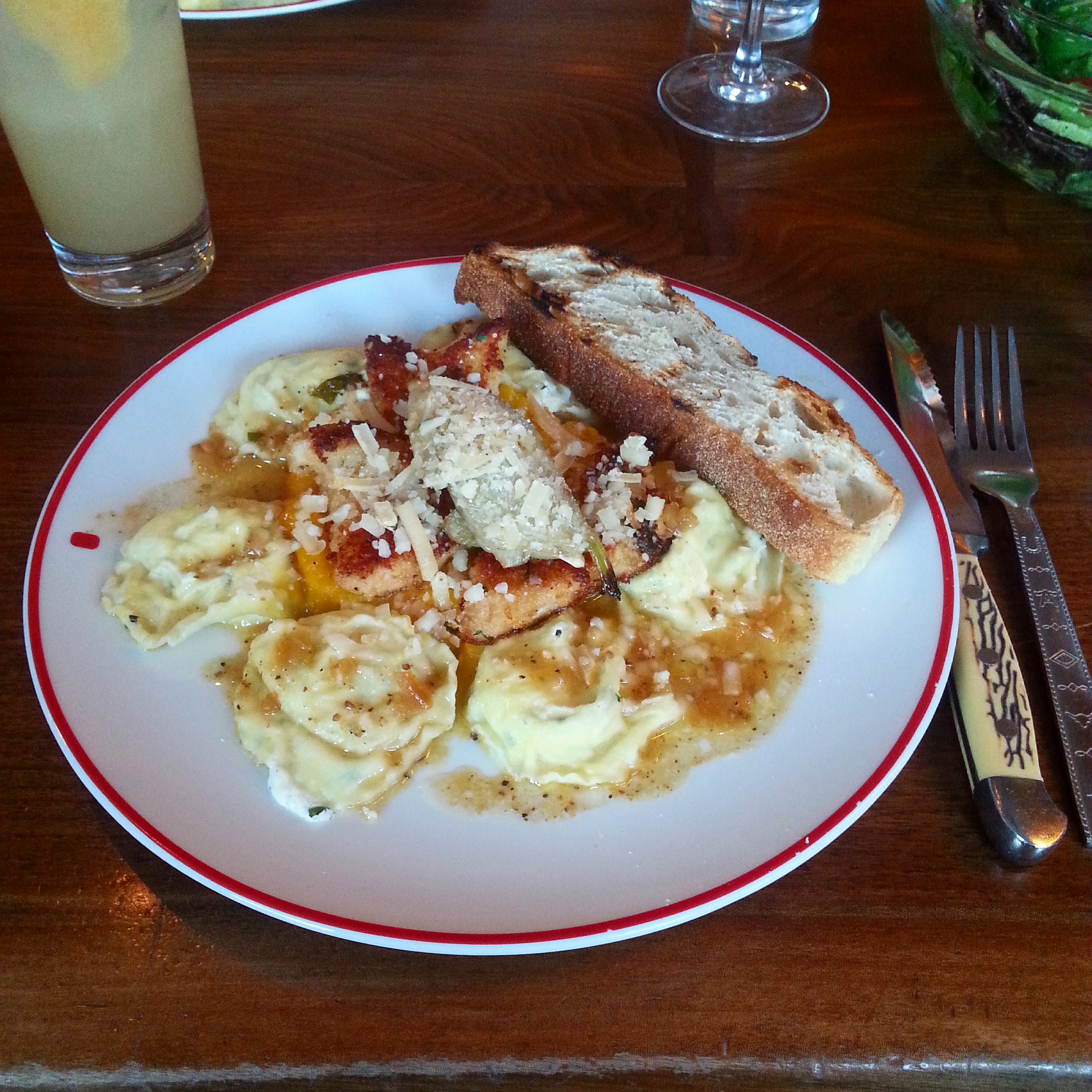 Tonight I was excited to be trying out a restaurant that I’ve read good things about. Founding Farmers aim to serve great ethical American comfort food while supporting American farmers. Good thing we had a table booked as it gets super busy. The waiter said some great things about their goat cheese ravioli so I decided to give it a try. The ravioli/tortellini were served with a chicken cutlet and on a bed of smooth butternut squash purée. I was very happy with my choice!