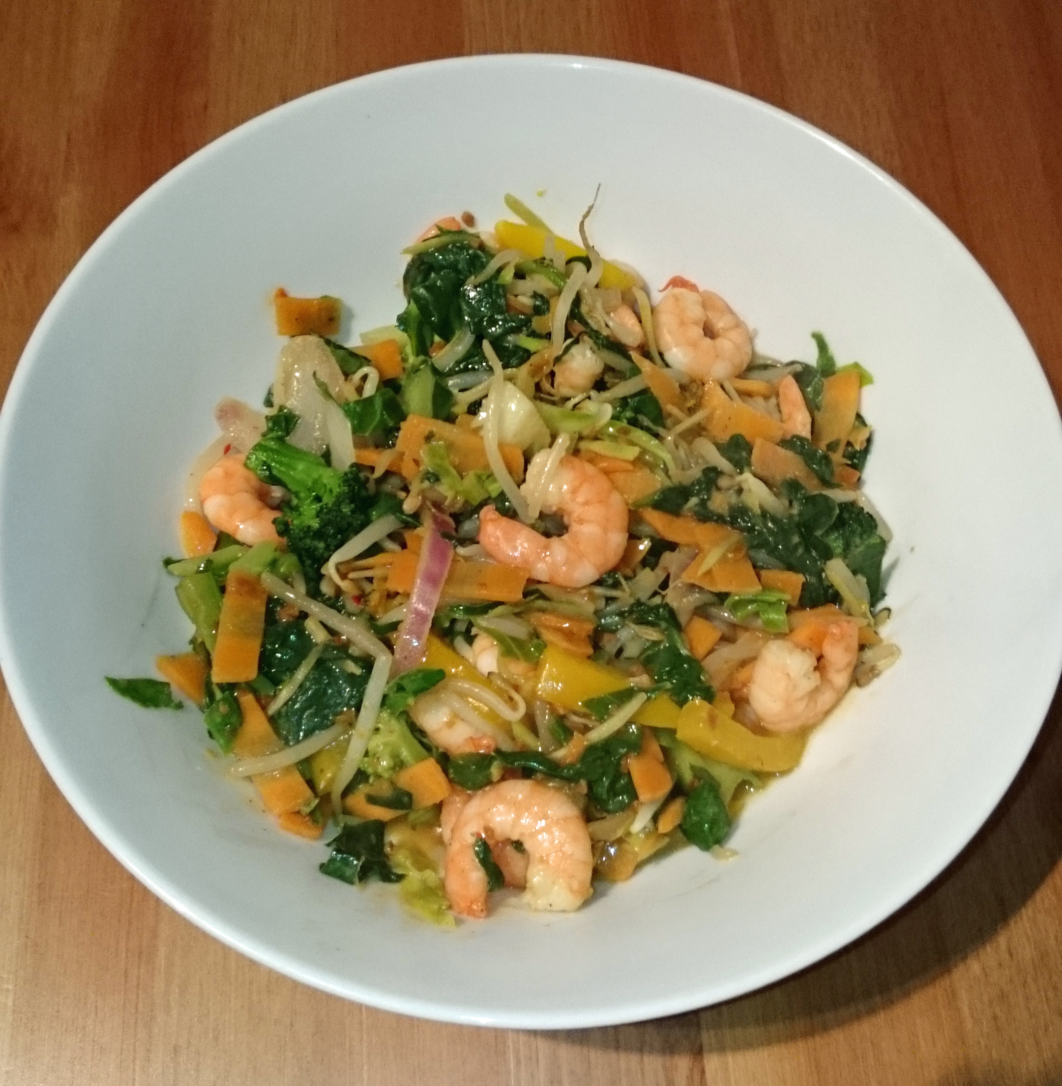 I’m a big fan of stir-fries but we haven’t had many yet this year. I guess I like being able to chuck left over vegetables into a pan and knowing that it will usually come out nice. This was a pretty simple prawn stir-fry, which I served with a packet of Amoy satay sauce. Easy and delicious!