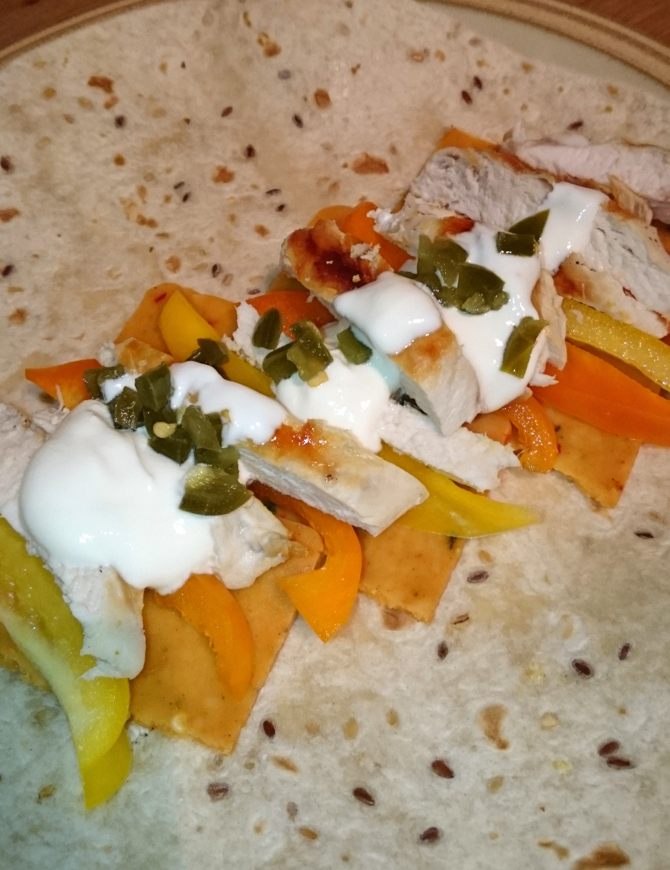 This was inspired by a chicken “Santa Fe” wrap that I had when I was in Santa Monica earlier this year. We grilled some chicken to go on the wraps and then topped the chicken with Sainsbury’s “Mexican” cheese, chopped peppers, jalapenos, and some soured cream.