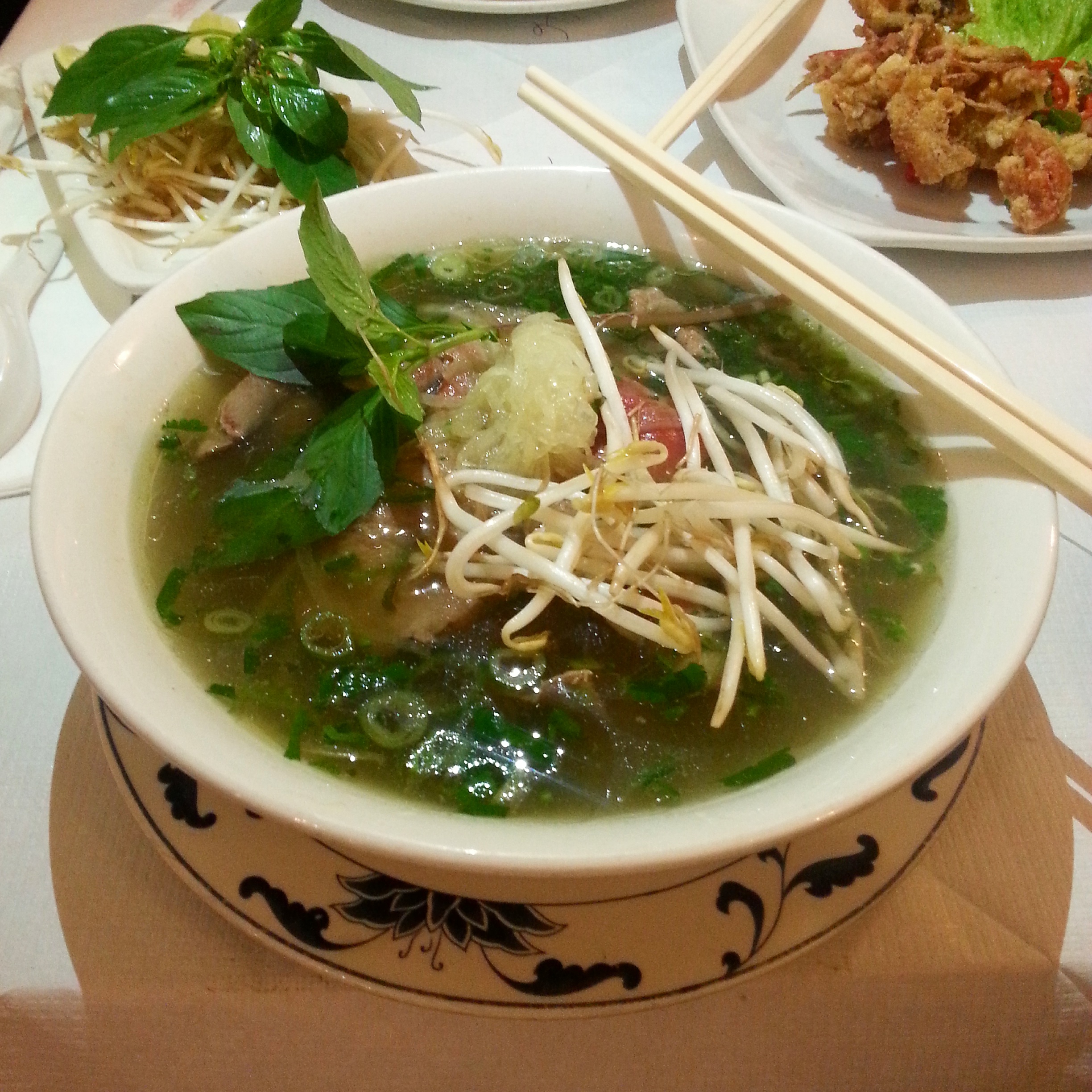Another Feast of Nations! There have been so many so close together but it’s so hard to decline when there are such interesting cuisines! I’ve eaten at Vietnamese restaurants before, but I was really keen to eat at Sông Quê Café tonight. Liz makes a real effort to find restaurants that serve authentic food and really stay true to that country’s cuisine. Mark and I wanted to try the traditional crispy pancake to start, but I also had my eye on the spicy soft-shell crab and just couldn’t resist. It was my first time trying soft-shell crab and it was just to die for and the portion size was pretty generous. The same can be said for the pancake which was also delicious and I would have been satisfied if I had been served that as a main course! But no – that was still to come! Mark and I both went for the Phở as that was clearly a specialty of the restaurant and a well-known Vietnamese staple. Again, the portion size was really impressive and the broth was rich and aromatic poured over the beef to cook it through. I loved every mouthful!