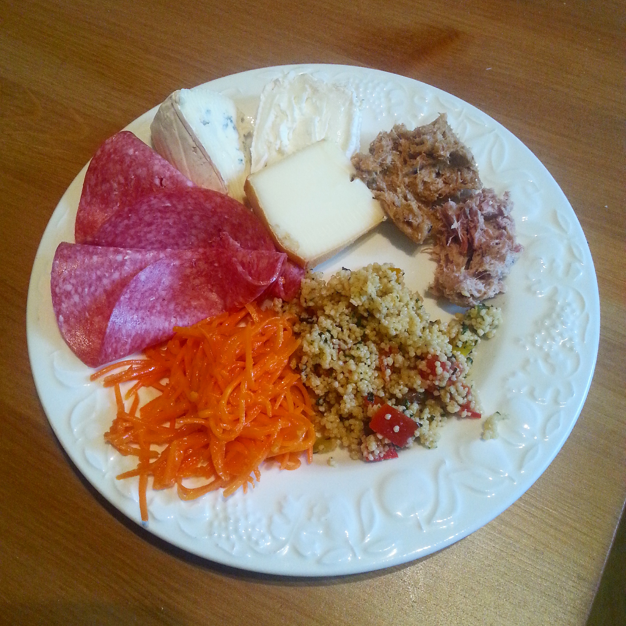 We made it to 300 days! Today we celebrated our achievement with a plate of our favourite french goodies. Some french baguette, duck and also chicken rillettes which is similar to pate, some grated carrot in a yummy dressing, some couscous, some cold meats, and of course some cheese!