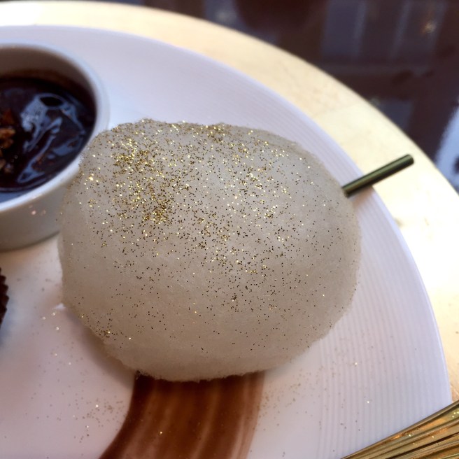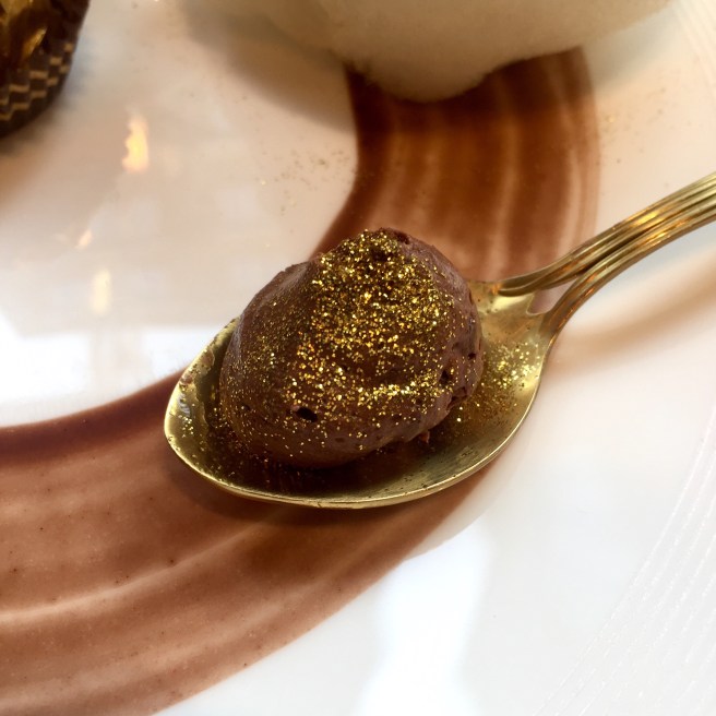 The first dessert was to represent the whole hazelnut core and was a whole roasted hazelnut inside a smooth chocolate-praline mousse and served on a golden spoon. This was one of my favourites – I loved the thick, velvety mousse that was almost like Nutella in texture and who doesn’t love Nutella?