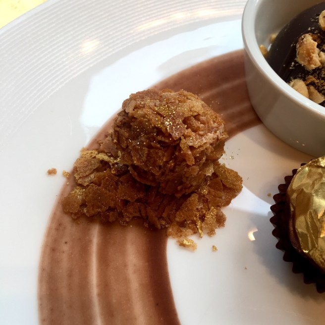 I know what you’re thinking – wait a second, that’s all of the layers of a Ferrero Rocher but only four desserts? Yep – the fifth was spun sugar with golden edible glitter as an homage to the iconic golden foil wrapper.