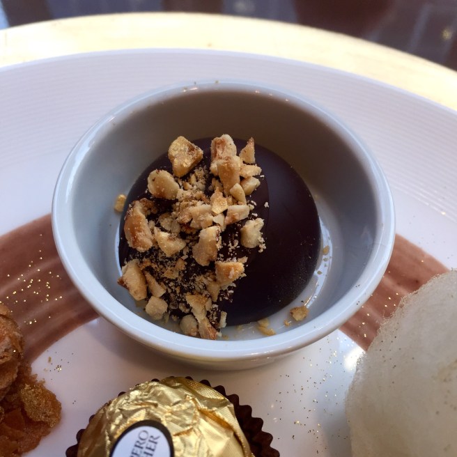 Next up was a dome of dark chocolate topped with hazelnut pieces to represent the outer chocolate and hazelnut layer. They introduced a bit of theatre with this one, coming over with some hot chocolate sauce to pour over causing the dome to melt into a delicious chocolaty sauce.