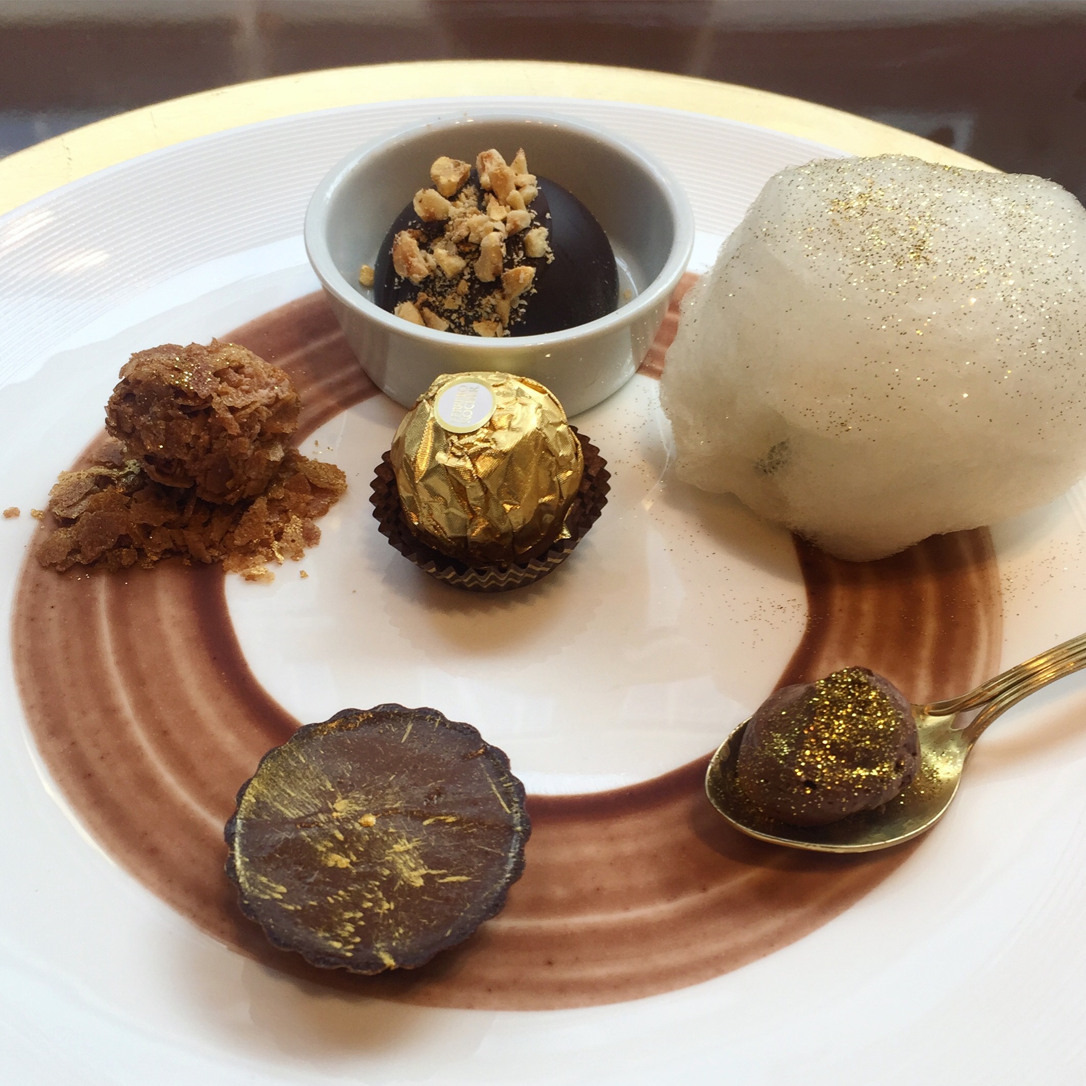 The idea of Dolce by Ferrero Rocher is a celebration of the different textures and layers in a classic Ferrero Rocher chocolate and so they have created five mini desserts each inspired by a different layer. We were served a tall, gold-rimmed glass of Prosecco as the staff explained the idea and our platters were being prepared.