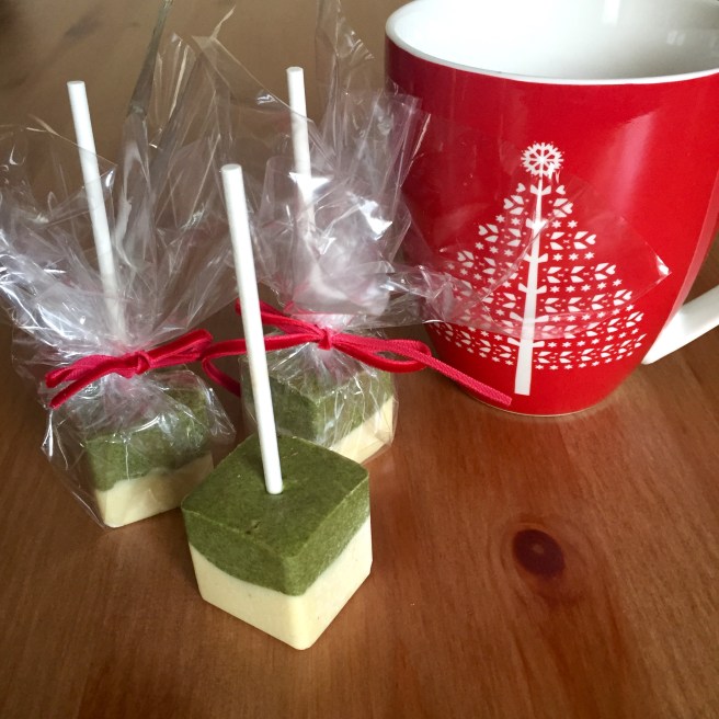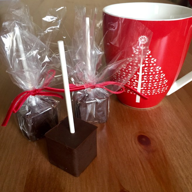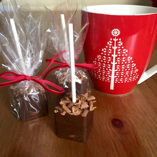 The basic kit you need is a Bain Marie (just a heatproof bowl over a saucepan of water) for melting the chocolate, a silicon large ice cube moulds like this one as regular sized ones are a bit small, and some lollipop sticks. Then you’ll want some presentation bags and ribbon to decorate.