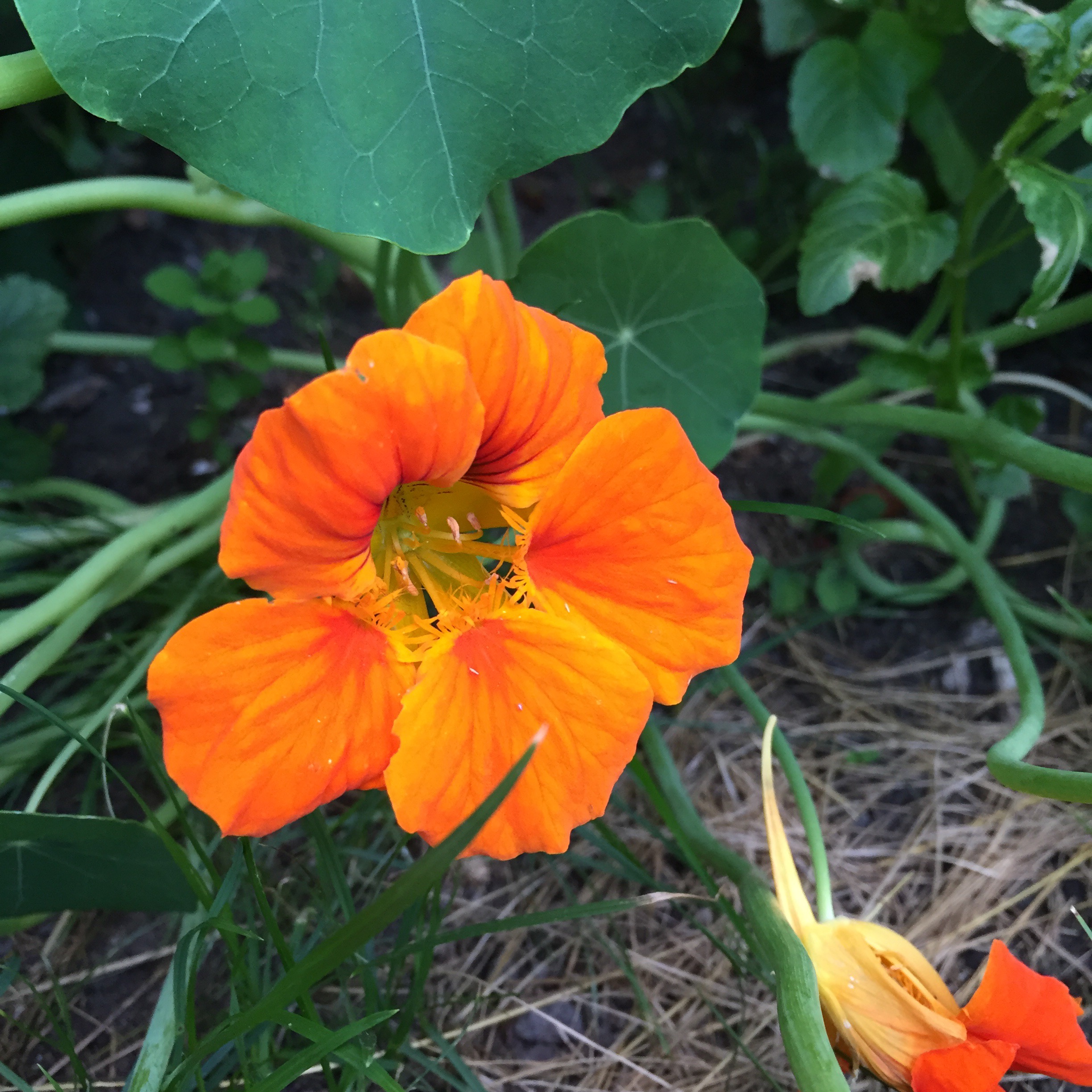 The first signs of success were the nasturtiums. I’ve wanted to grow nasturtiums for a while because their leaves make great garnish as well as the flowers, and they have a lovely peppery taste similar to rocket that works really well in salads. They germinated really quickly and it wasn’t long at all before they were growing out of their small pots and ready for the garden! I tried planting some in a large pot, and some others in the flower beds. They are really leggy so it’s great if you can plant them against a trellis or something that they can climb – otherwise they start sending long shoots out across the garden! The nasturtiums we planted into the flower beds did fantastically well and we’ve had loads of leaves and flowers!