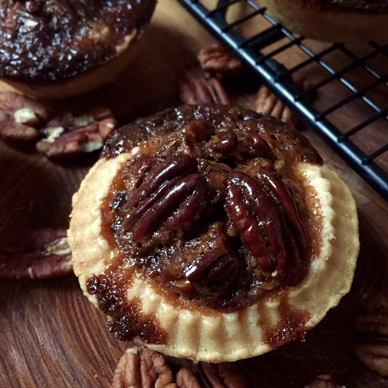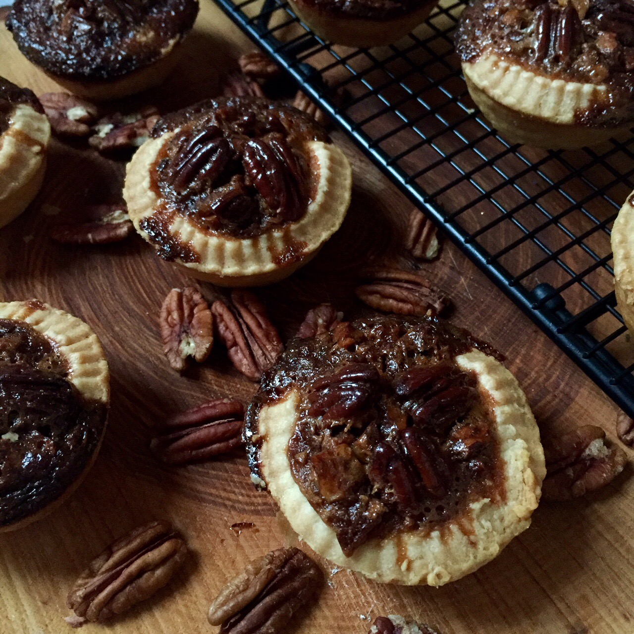 These sweet, sticky beauties tasted absolutely delicious, but perhaps haven’t been fairly represented by my presentation or photography skills in this post. In a bit of a happy accident, I over-filled the pastry cases, meaning that the pecan filling spilled out over the edges a little. I personally love the sticky, toffee crust that you get when this happens, so much so that I might aim for this next I make these pies! Also, the winter evening crept up on me as these were cooking so I wasn’t left with much natural light, but I thought I’d try to embrace that and work with some deeper shadows and intensity for these photos.