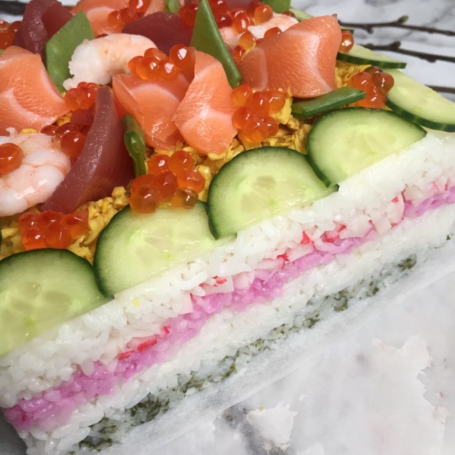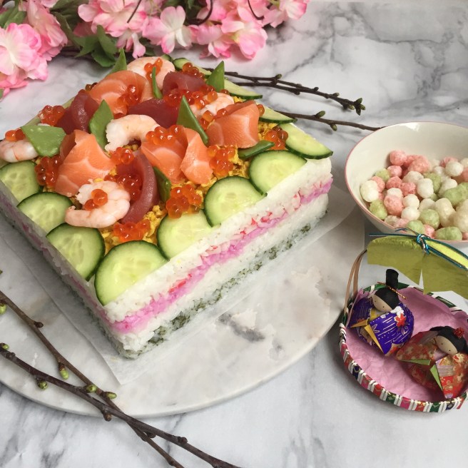 Chirashizushi is the traditional meal eaten for Hinamatsuri, which is essentially a bowl of seasoned sushi rice topped with sashimi, egg, nori and other toppings. I decided to have a go at something I’d seen pictures of on a couple of blogs – a chirashizushi cake! I cooked the rice, seasoned it with sushi vinegar and layered the rice in a square cake tin lined with clingfilm so I could get the sticky rice out once it was layered and shaped. For the green layer I stirred in some nori flakes, and for the pink layer I added a tiny spoonful of the juice from a jar of beetroots and it worked perfectly! You could also use chopped crab sticks to get a lovely mottled pink effect. Traditionally I think it’s common to use shredded codfish, but I wasn’t able to get that. Once the rice layers had cooled in the fridge, I took the cake out of its mould and got to work on the really fun part – decorating! I started with a layer of shredded omelette to give the yellow base colour, and then placed some tuna and salmon sashimi over the top. I added some prawns, mange tout and cucumber, and finished off with the beautiful orange ikura roe which just look like little gems scattered over the chirashizushi cake and give delicious little pops of flavour.