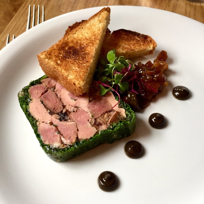 Now without further ado – on to the food! We all chose the ham hock and game terrine for our starter. The chunky, meaty terrine came wrapped in savoy cabbage leaves and served with a delicious ale chutney – I loved that it had tiny florets of cauliflower in it.