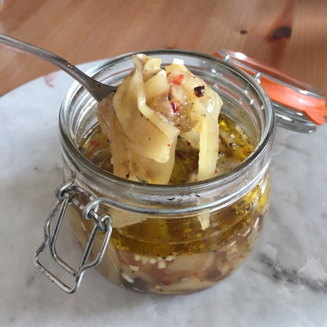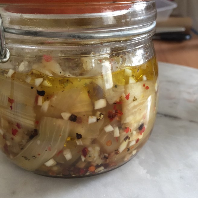 2. Rinse the aubergines (so they’re not uber salty – bluergh!) and place in a saucepan with the water and vinegar. Heat gently until cooked through and tender. Drain the aubergines but keep the pickling liquid to one side.