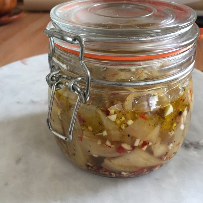 3. Layer the aubergines in a preserving jar with the spices and garlic pieces. Pour over the olive oil and top up with leftover pickling liquid.