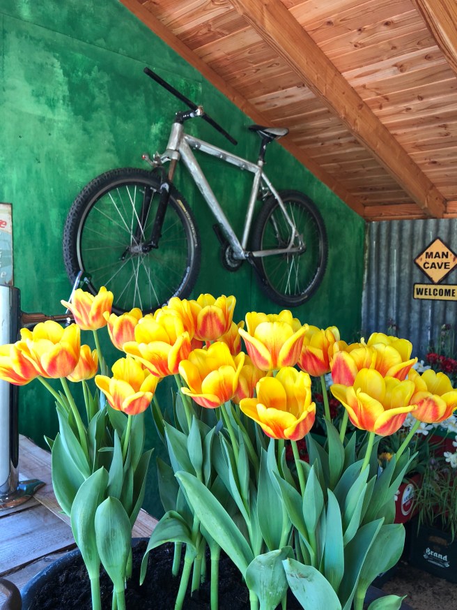 It’s difficult to describe the sheer scale of the Keukenhof gardens and the myriad styles and colours of tulips. I was in photograph heaven! There are tulips in all colours – we even found the perfect colour match for Mark’s shirt. As well as the countless displays of tulips, there was a beautiful lake with banks blanketed in colour. We had a bit of fun running around the maze, seeing the windmill, looking out over the neighbouring tulip fields. There’s certainly plenty to see and points of interest amongst the flowers. We even found the hipster garden which was a great and hilarious idea. There were flowers planted into old beer crates, a guitar, bicycle, a block on which to chop wood, and other such hipster-ly items – and more tulips, of course!
