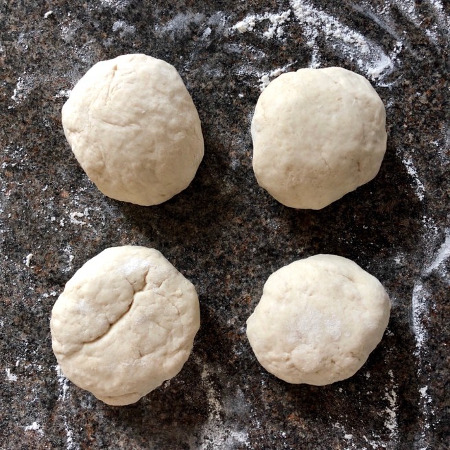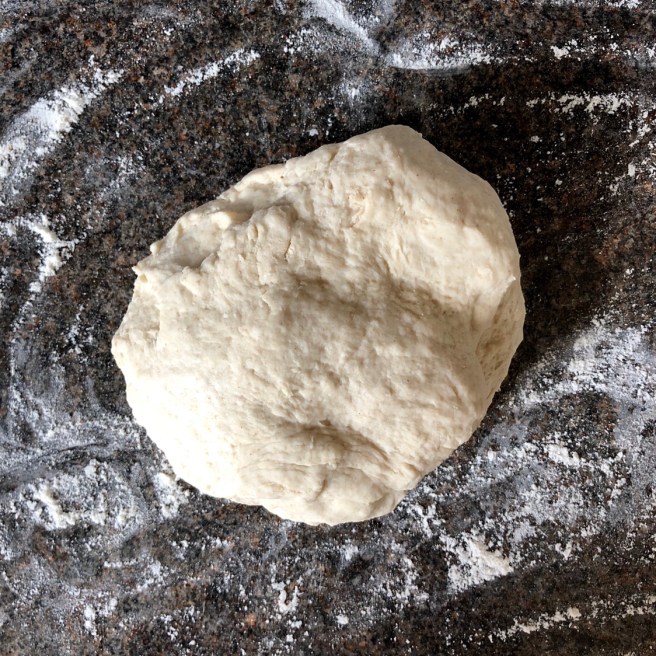 To make the dough, combine 2 parts plain flour with 1 part water – 2 cups of flour makes about 4 large breads. Add the water to the flour gradually until you get a fairly wet dough, but it doesn’t stick to your fingers. You need to work it and bear with it as it will stick your fingers together to begin with, but it comes together eventually. Don’t be afraid of how sticky the dough is – you certainly don’t want it to be too dry.