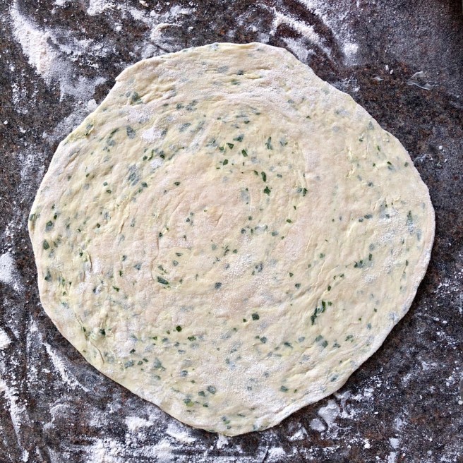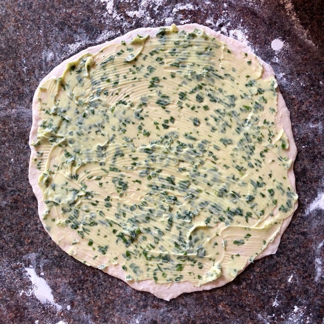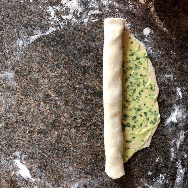 Roll out the dough on a lightly floured surface so that it’s as thin as you can get it without it splitting. Don’t be tempted to put too much flour on as it will become too dry and grainy. Once it’s rolled out, spread over a generous helping of wild garlic butter – don’t scrimp here, it’s not meant to be healthy! Roll the dough up into a log.