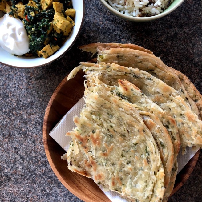 If you’ve ever had good paratha, you’ll understand the delicious buttery, flaky brilliance of this Indian flatbread. You’ll probably also know the disappointment of ordering it somewhere and being served something dry, or otherwise a poor imitation. A friend of mine, who I’m now forever indebted to, taught me some tricks to making beautiful paratha-style roti at home. It wasn’t nearly as tricky as those failed restaurant attempts would have had me believe! The real difficulty now is resisting the temptation to make them ALL. THE. TIME. especially knowing how much butter is used…