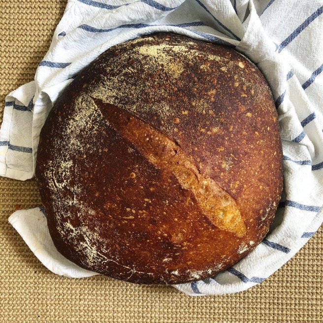The process was long, required a bit of patience, trust, and I was worried throughout that it might not work, but the result was amazing – I couldn’t have wished for a better first loaf from my little Sebastian! The crust was crisp and although it took on quite a dark colour, it didn’t taste burnt. The inside was soft and perfectly sour – absolute heaven spread with some yummy butter. The recipe actually makes two loaves, but it freezes really well for toast so that wasn’t a problem at all.