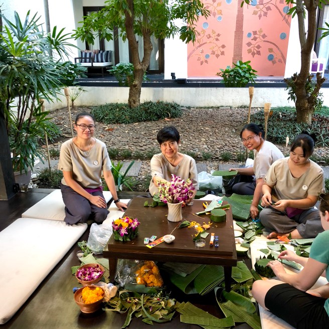 Our hotel, U Chiang Mai, had workshops so that guests could make their own krathong which they could then float on the swimming pool or take to the river. They gave us a banana tree trunk base, taught us how to fold the banana leaves to make the basket shape, and then we filled them with beautiful purple orchid and yellow marigold flowers. They were finished off with some incense sticks and a small tealight.