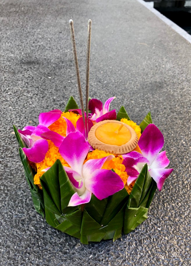 Loi Krathong literally translates to floating a krathong – a handmade basket or arrangement of flowers and banana leaves. People place these beautiful arrangements on the river as an offering to the goddess of water and ask her to take away any suffering or problems.