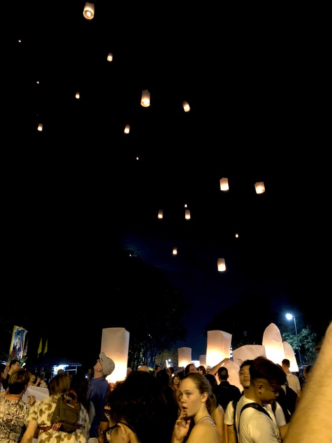 There used to be organised events where lanterns were released all at the same time, but the tickets have become quite pricy and exclusive. A lot of people gather along Tha Phae Road near to the Naowarat Bridge and just start releasing them once there are lanterns beginning to appear in the sky around. If you want to release one, there are plenty of people selling them in the street so you won’t have a problem. Expect to pay around 50 – 70 baht. There were a few numpties releasing their lanterns before they had filled with enough hot air to properly rise, or directly into trees. Nobody wants to be that person! Although, I guess the sense of danger added to the fun…