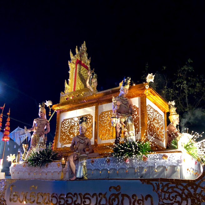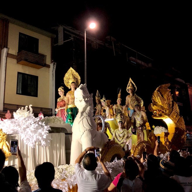 Local communities, groups and businesses take part in a huge parade with people in various traditional Thai dress and glittering floats. It literally went on for hours. We saw the start, decided to go and grab some food, and it was still going when we came back! Apparently beauty pageants are a big thing during Loi Krathong, although I’m not clear on the history of it. It was fun to watch nonetheless.