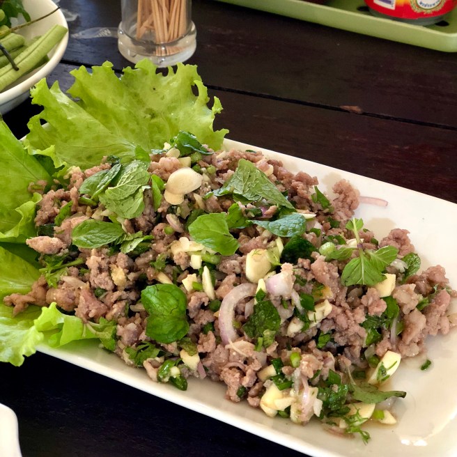 Street food and small “hole-in-the-wall” joints are the beating heart of the food scene in South East Asia, and Luang Prabang is no different. At various points in the day, pop-ups will be set up in the markets or by the roadside serving all sorts of fare. The night market in particular has plenty of options serving local dishes like their local version of khao soi. Khao soi in Laos is different to its Northern Thai cousin in that rather than a thick, creamy curry broth, the noodles are served in a thinner, aromatic broth more similar to phở. We found a great place on Kounxoau Road with a sign that said “Good People, Good Food, Good Price”. Their khao soi was delicious and we tried their yummy laab salad too.