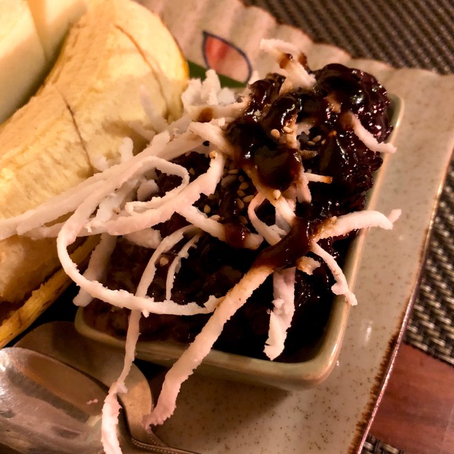 Before we got stuck in, we were given an infused Lao Lao whiskey shooter. I’m glad I went for the honey flavour as I’m not a huge whiskey fan – what a way to start the meal! The dried bamboo chips that they brought for us as an aperitif were delicious – surprisingly sweet and infused with a bit of kaffir lime. I loved the section of snacks and appetisers with Luang Prabang sausage, sien savanh (Laos beef jerky), crispy river weed, and a selection of delicious jeow dipping sauces to have with them. The mains were tasty as well, particularly the stir-fried pumpkin. Mark and I were really impressed with the dessert of warm sticky rice with coconut shavings and a thick, glossy tamarind sauce.
