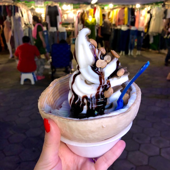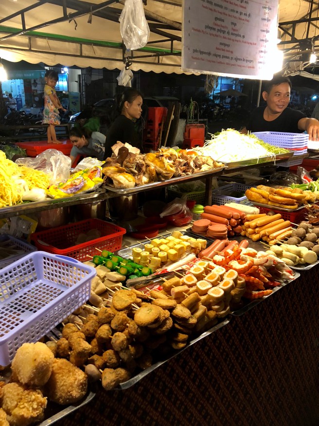 This market near the river on Preah Sisowath Quay mainly sells clothes with a few stalls offering souvenirs or more tourist-geared goods, but it’s a great place to get some food. There’s a large area of mats laid out surrounded by food stalls where you can get skewers, dumplings, noodles, fried rice and more. The mats are generally reserved for customers of the neighbouring food stalls so it doesn’t get overcrowded and is a really nice place to enjoy some great food and a lively atmosphere. We tried some sugarcane juice for the first time which was sweet as you’d expect, but surprisingly refreshing. The soft-serve ice cream in a coconut bowl with pieces of fresh coconut was the perfect pudding.