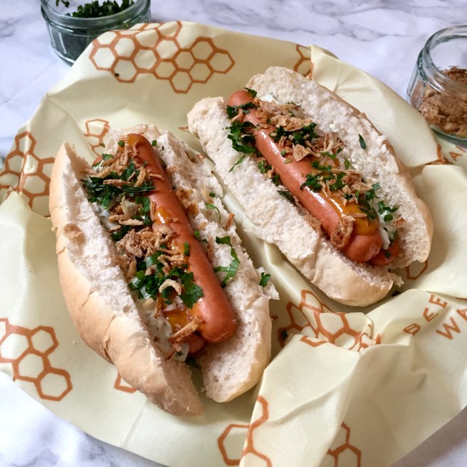 - Assemble each of the hot dogs in a bun and top with the sauces, crispy and raw onion, and herbs. Enjoy immediately!