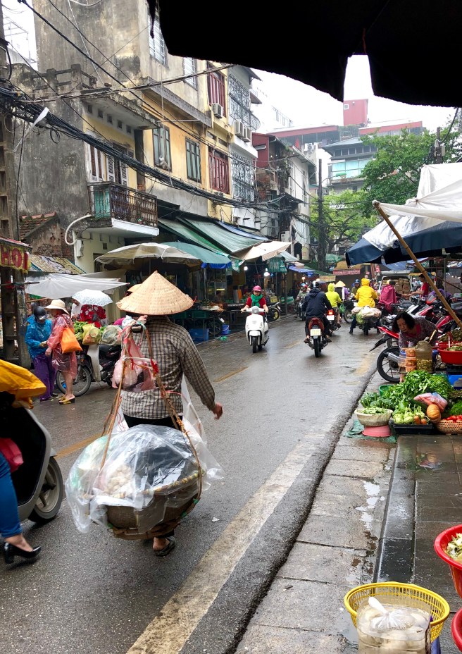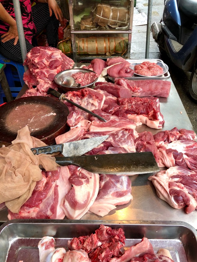 Our teacher, Nhi, met us at our hotel in the old quarter at 9am and we headed straight to Dong Xuan market to pick up ingredients. As is fairly typical of markets in that part of the world, there were plenty of vendors selling meat uncovered on big metal tables which is VERY different to the way meat is handled and sold back home! We saw huge displays of herbs, vegetables and more as we made our way around the market and I was introduced to yet more new ingredients like jicama, pomelo, and silkworms. We didn’t buy any of the latter though.