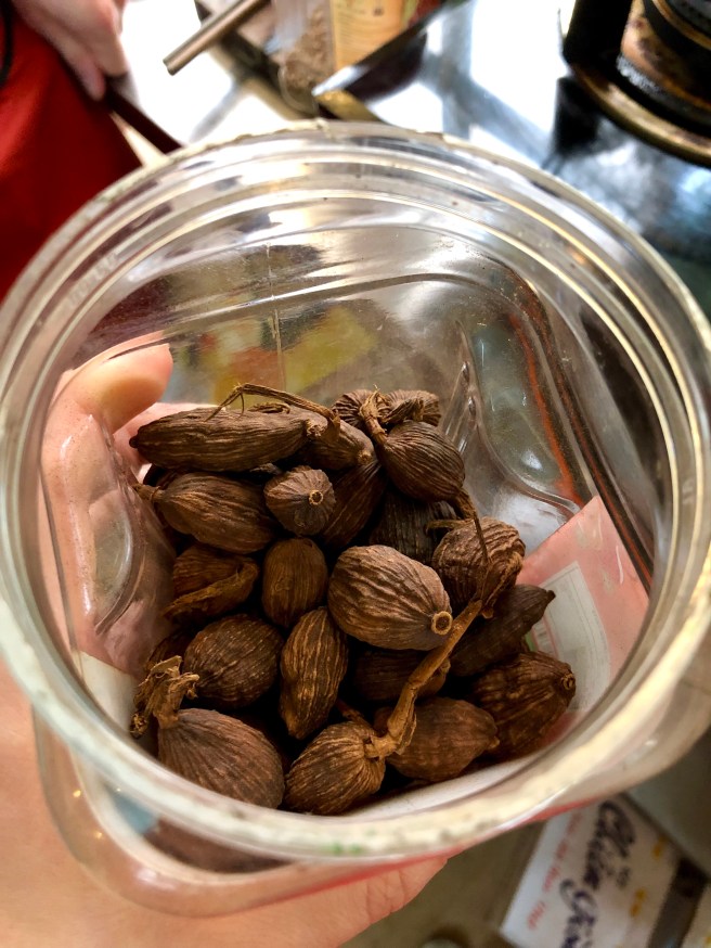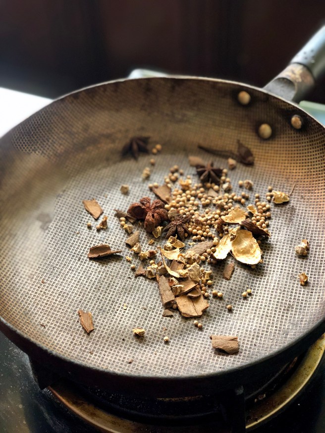 Pho must be the best-known Vietnamese dish throughout the world and so it was top of my list when choosing the dishes we wanted to learn in our class. The clear, spiced beef broth is normally simmered for 6 to 8 hours, regularly skimming of the scum that forms at the surface, to get the beautiful flavour. We obviously didn’t have that kind of time and so our teacher taught us how to grill the bones to kick-start that release of flavour. We also charred some shallot, onion and ginger, and toasted the vital spices to add to the pot with the beef bones and brisket: star anise, coriander seeds, cinnamon, and black cardamom. I’d never come across black cardamom before, but one sniff and I was in love. The pods are dark and much bigger than their green counterparts, about an inch in length, and have the familiar fragrance of cardamom but with a real smoky depth as well. I actually bought some from a lovely little spice shop in the Old Quarter called Viet Aroma so I can experiment with it back at home, and I’m sure it can be found in UK spice shops too for when I run out. We left the broth simmering away under the watchful eyes of the other kitchen staff while we moved on to our other dishes.