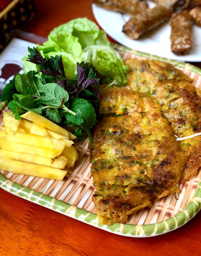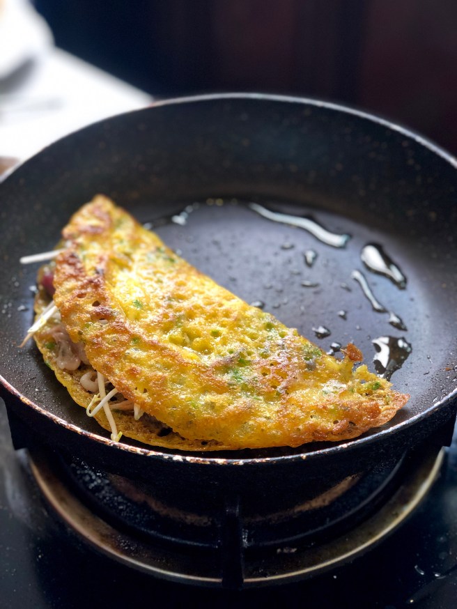 Banh xeo is a crispy yellow Vietnamese pancake named after the sizzling sound it makes during cooking. The main difference to other pancake batters is the incorporation of rice flower and turmeric which obviously gives the batter its colour. The biggest surprise was the amount of oil that goes into cooking the pancake to make it crispy. A little was added to the pan to begin with as you’d expect, but more was added at regular intervals while the pancake was cooking. The filling of meat, tiny shrimp and beansprouts were added during the cooking and the pancake was folded over and turned until it was super crisp.