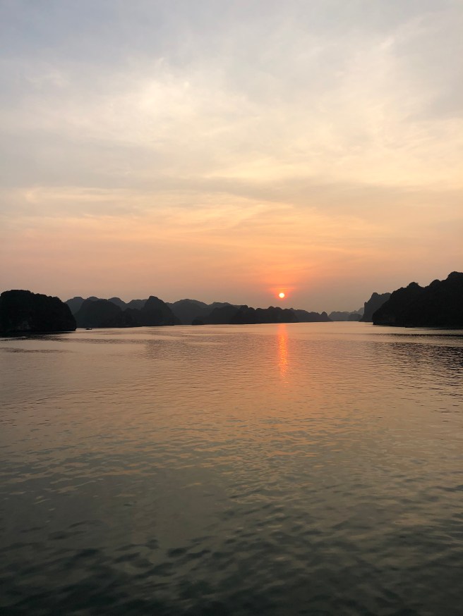 In the early evening on the sun deck we were treated to a Vietnamese cooking demonstration where we saw how to make spring rolls and could have a go at rolling them ourselves as well. Everyone got a bit distracted when the sunset began in earnest and lots of us got up to watch the sun dip behind the islands. Understandable though right?